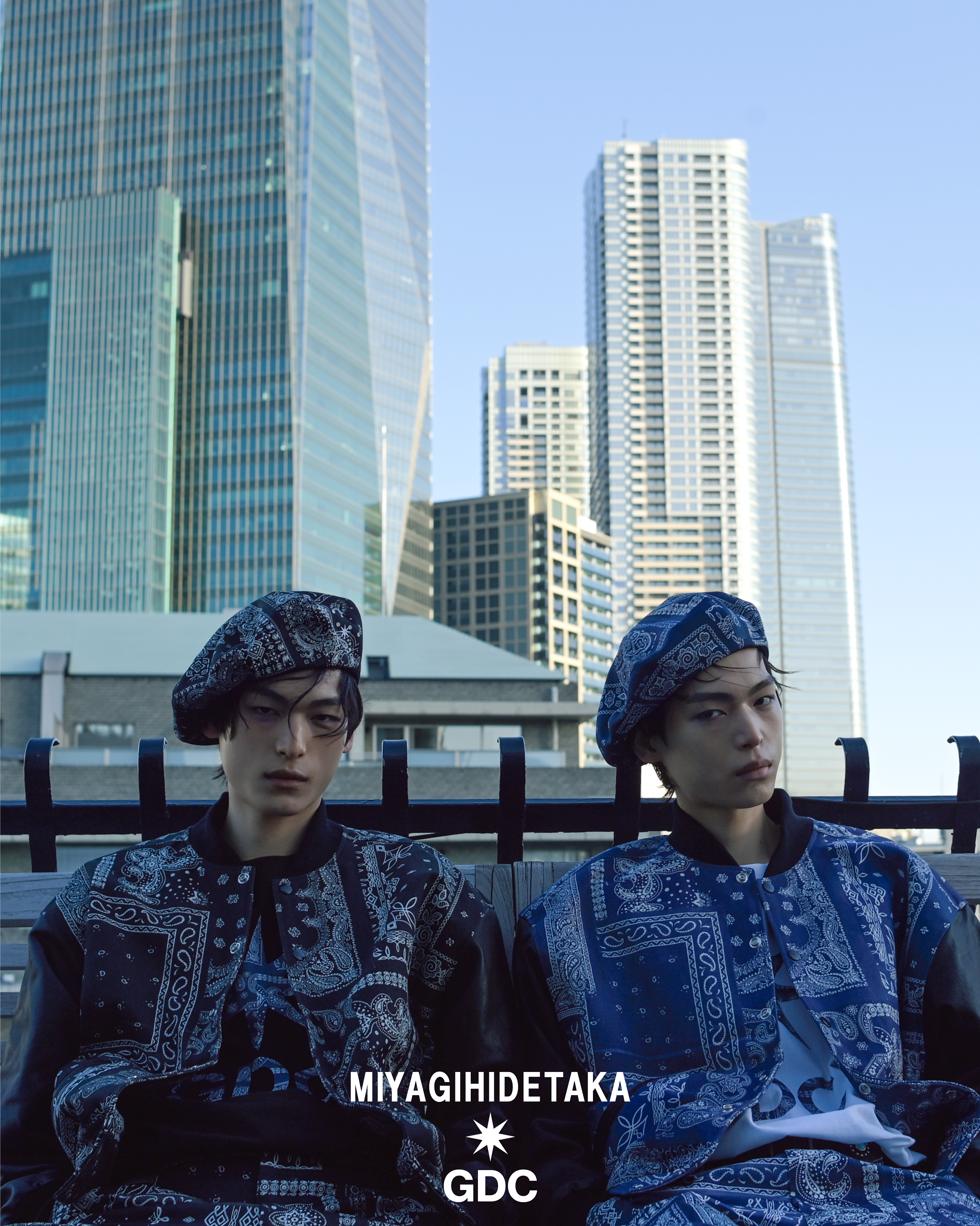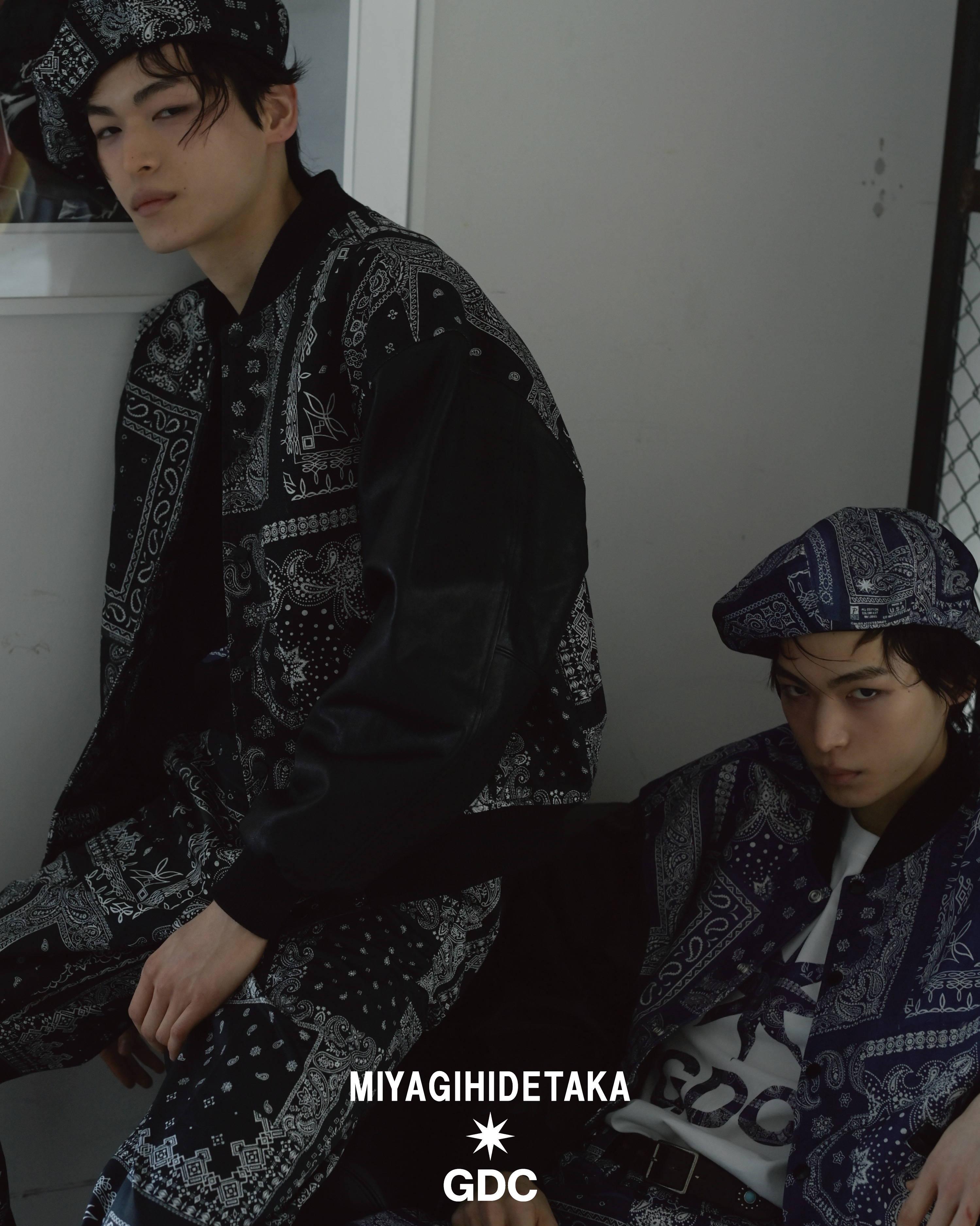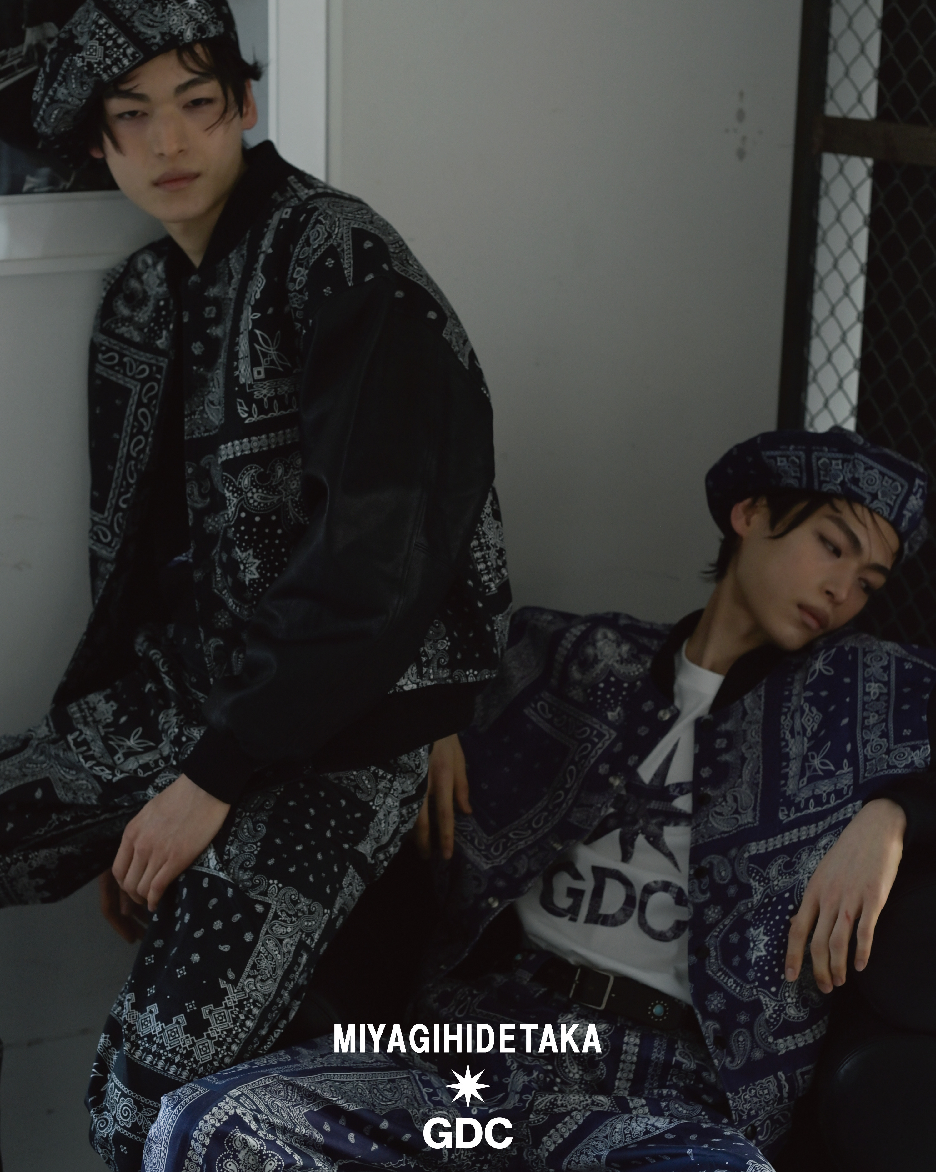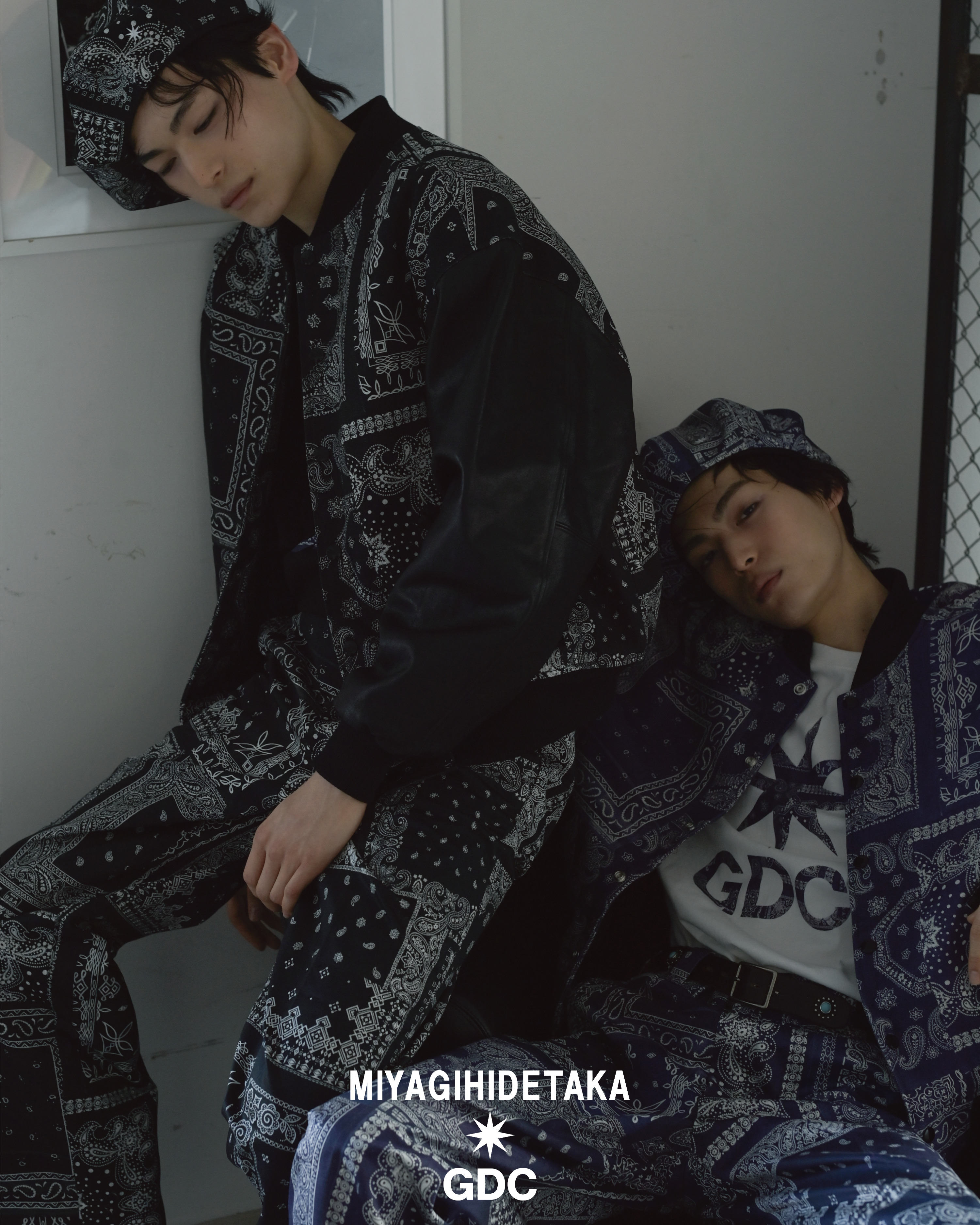 中でもスタジャン、ベレー帽、キューバシャツ、ビッグチノパンツは、GDCを象徴する定番アイテムを〈MIYAGIHIDETAKA〉のバ ンダナ柄で再構築した、本コラボレーションの核となる存在。カラーは着回しのしやすいネイビーとブラックの2色展開とし、スタイルを選ばず幅広いコーディネートに取り入れられる仕上がりとなっている。撮影は熊谷自身が手掛け、独創的なクリエーションを軸とする〈MIYAGIHIDETAKA〉の世界観と向き合いながら、光と影の揺らぎを残し、その存在感をより際立たせるビジュアルへと昇華している。以上のアイテムは、3月7日(土)12:00より〈GDC代官山フラッグシップストア〉および〈GDCオフィシャルオンラインストア〉、〈MIYAGI HIDETAKA フラッグシップストア〉、またMIYAGIHIDETAKAが親交ある〈大阪IMA:ZINE〉にて 全国一斉発売される。さらに3月13日(金)からは、GDC初となる韓国でのPOPUPにて展開も決定。詳細はGDC公式 Instagramにて随時公開されるとのことなのでチェックして頂きたい。