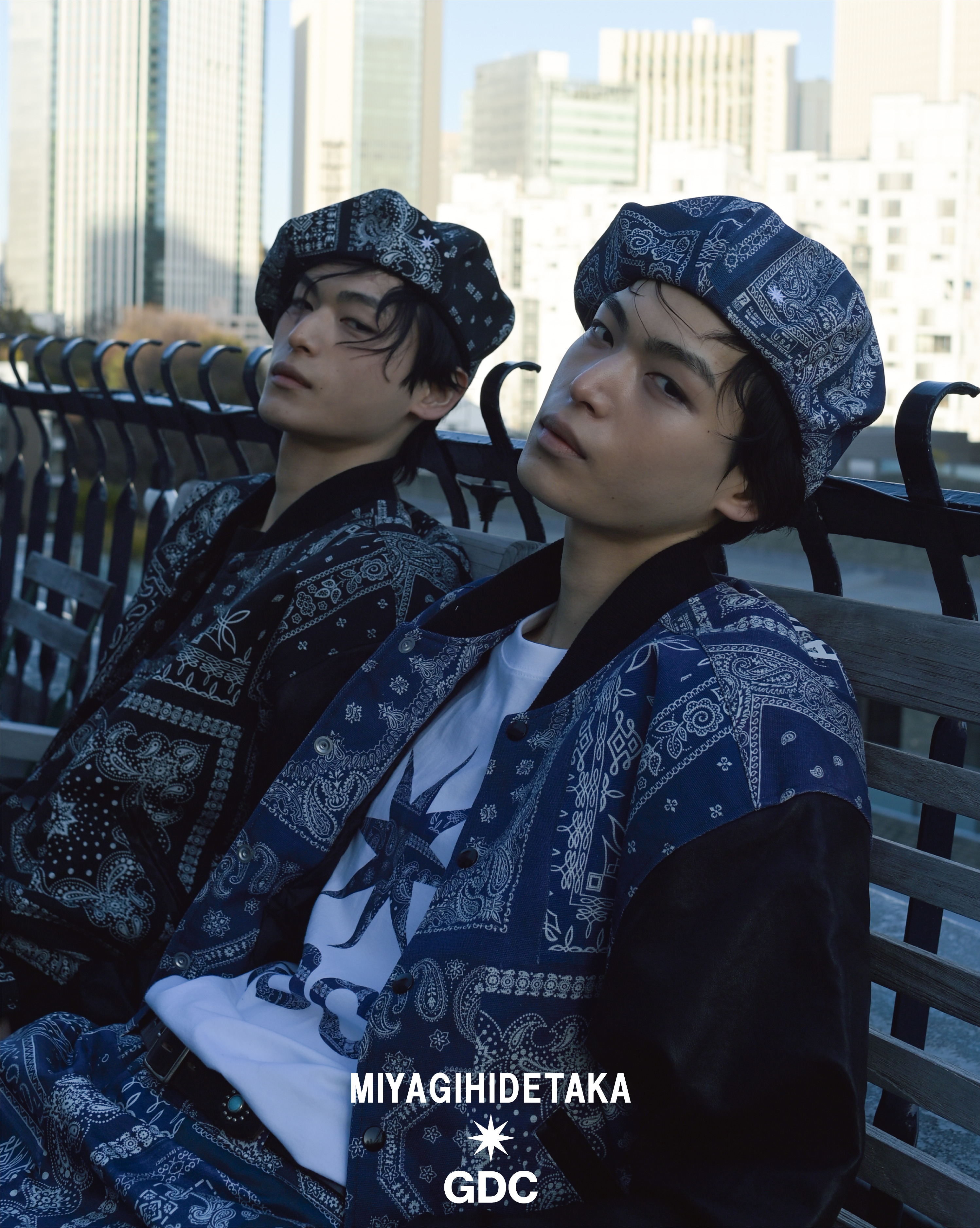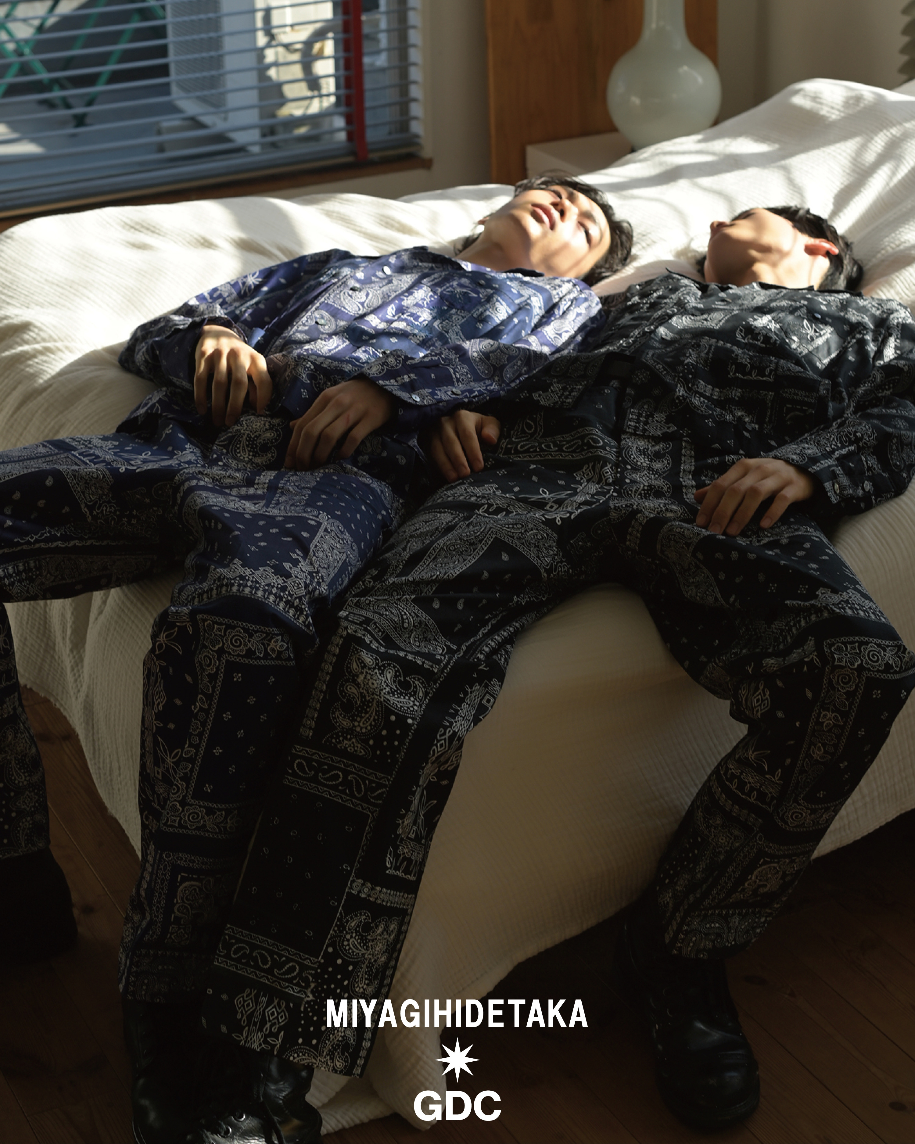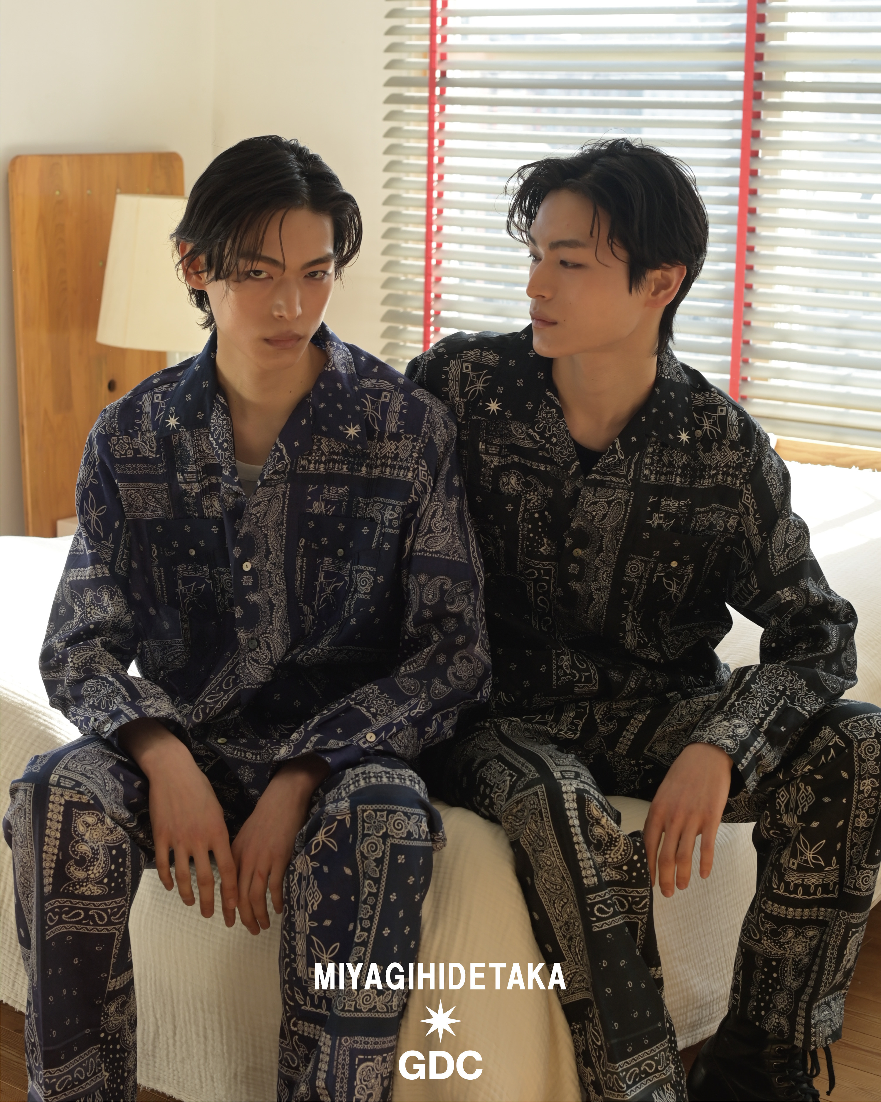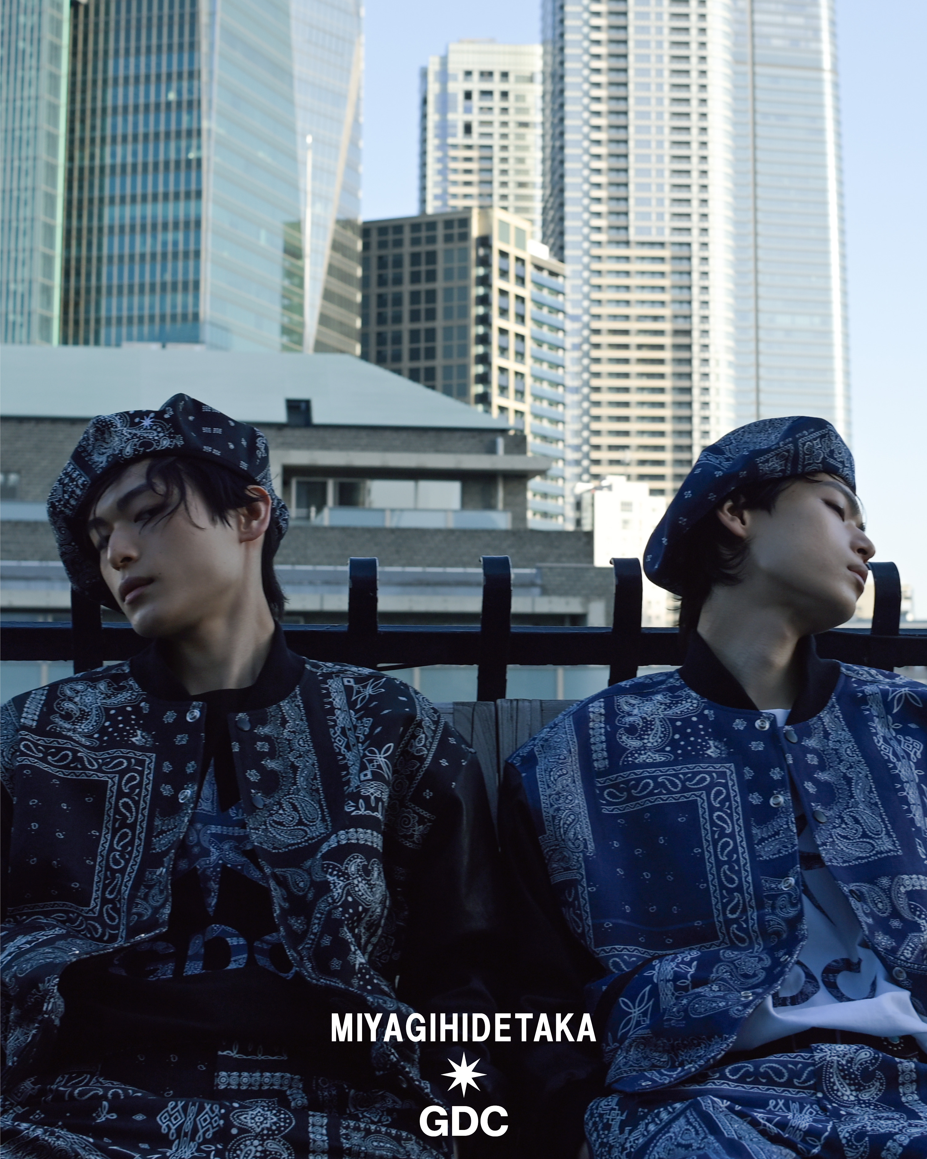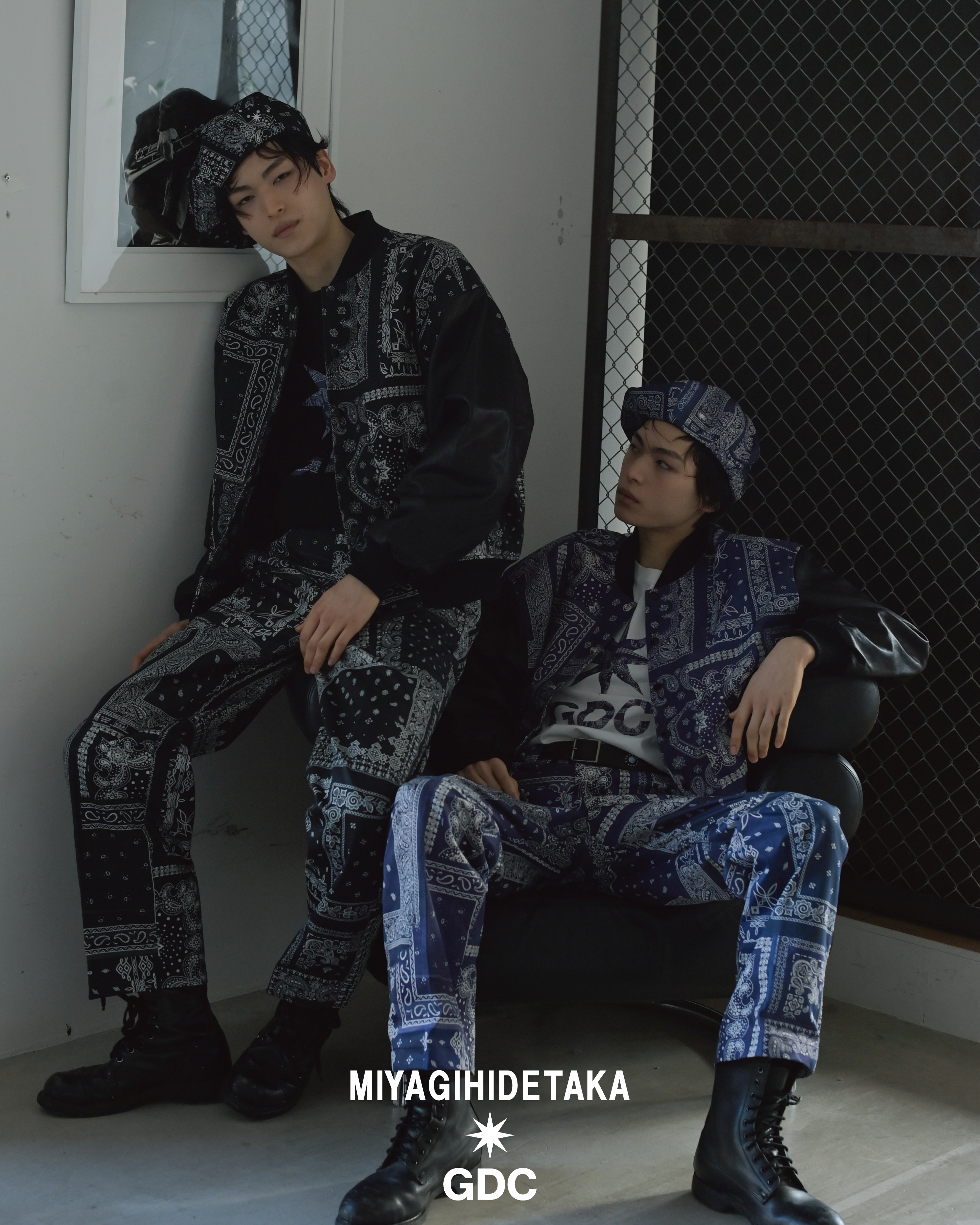 中でもスタジャン、ベレー帽、キューバシャツ、ビッグチノパンツは、GDCを象徴する定番アイテムを〈MIYAGIHIDETAKA〉のバ ンダナ柄で再構築した、本コラボレーションの核となる存在。カラーは着回しのしやすいネイビーとブラックの2色展開とし、スタイルを選ばず幅広いコーディネートに取り入れられる仕上がりとなっている。撮影は熊谷自身が手掛け、独創的なクリエーションを軸とする〈MIYAGIHIDETAKA〉の世界観と向き合いながら、光と影の揺らぎを残し、その存在感をより際立たせるビジュアルへと昇華している。以上のアイテムは、3月7日(土)12:00より〈GDC代官山フラッグシップストア〉および〈GDCオフィシャルオンラインストア〉、〈MIYAGI HIDETAKA フラッグシップストア〉、またMIYAGIHIDETAKAが親交ある〈大阪IMA:ZINE〉にて 全国一斉発売される。さらに3月13日(金)からは、GDC初となる韓国でのPOPUPにて展開も決定。詳細はGDC公式 Instagramにて随時公開されるとのことなのでチェックして頂きたい。