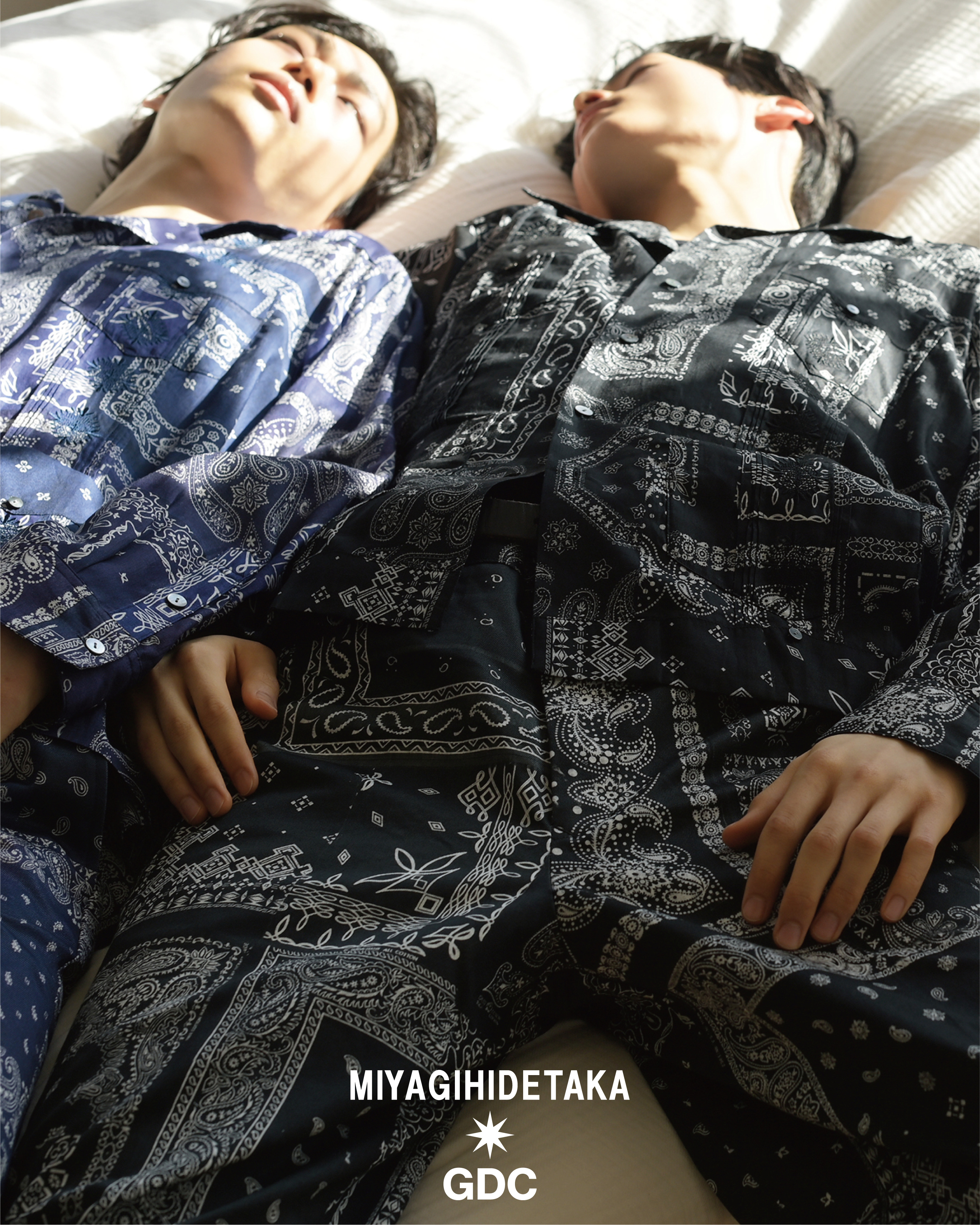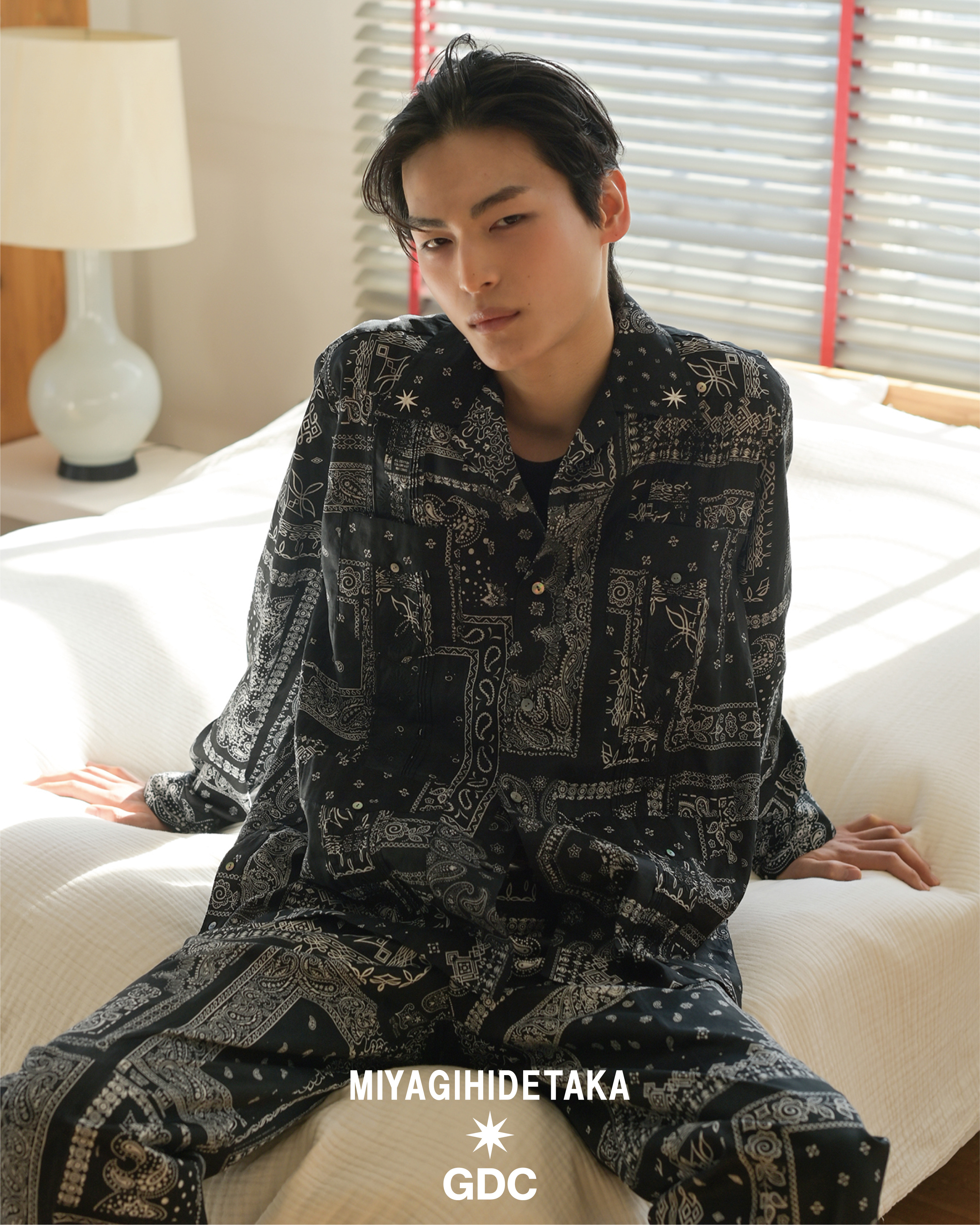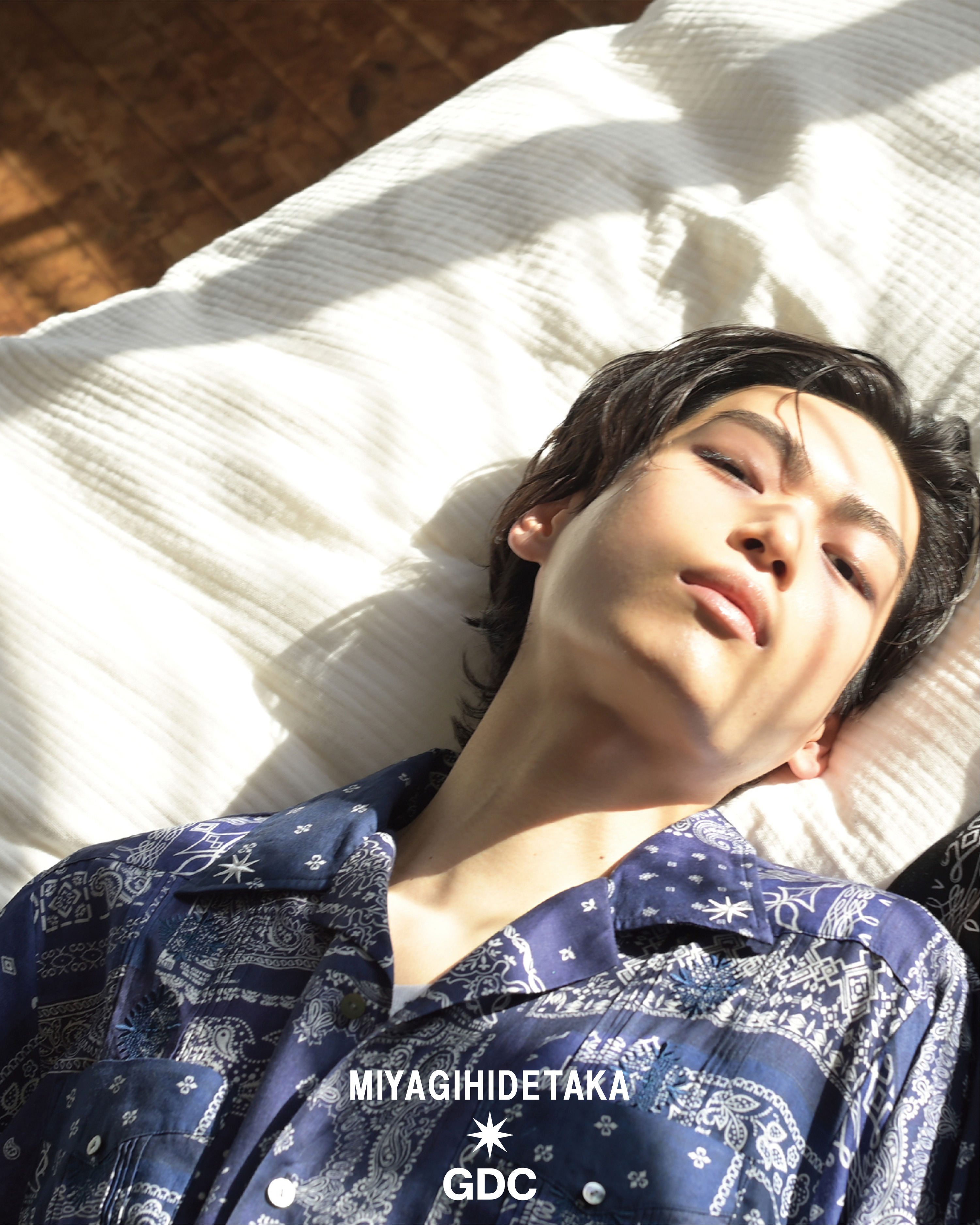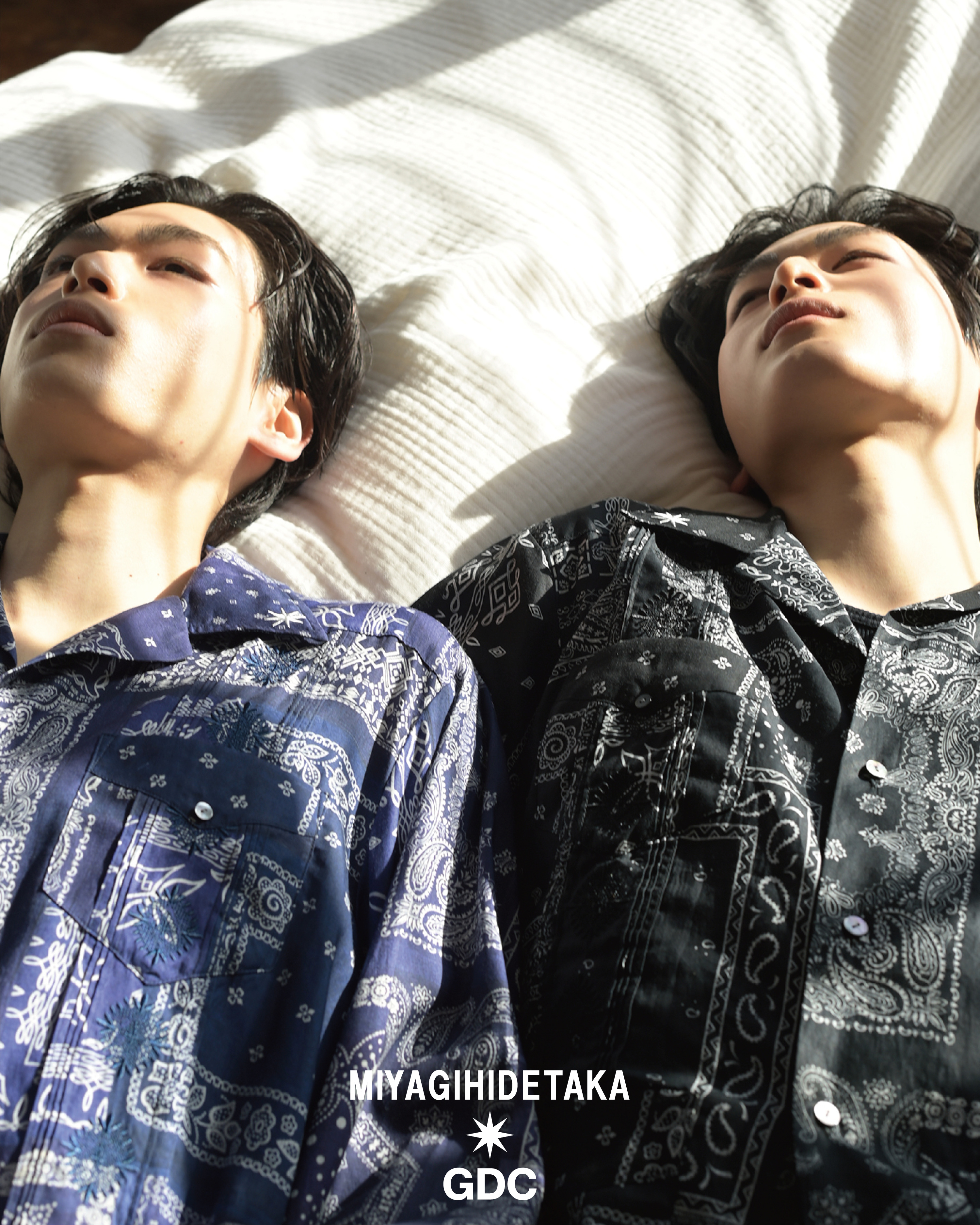 中でもスタジャン、ベレー帽、キューバシャツ、ビッグチノパンツは、GDCを象徴する定番アイテムを〈MIYAGIHIDETAKA〉のバ ンダナ柄で再構築した、本コラボレーションの核となる存在。カラーは着回しのしやすいネイビーとブラックの2色展開とし、スタイルを選ばず幅広いコーディネートに取り入れられる仕上がりとなっている。撮影は熊谷自身が手掛け、独創的なクリエーションを軸とする〈MIYAGIHIDETAKA〉の世界観と向き合いながら、光と影の揺らぎを残し、その存在感をより際立たせるビジュアルへと昇華している。以上のアイテムは、3月7日(土)12:00より〈GDC代官山フラッグシップストア〉および〈GDCオフィシャルオンラインストア〉、〈MIYAGI HIDETAKA フラッグシップストア〉、またMIYAGIHIDETAKAが親交ある〈大阪IMA:ZINE〉にて 全国一斉発売される。さらに3月13日(金)からは、GDC初となる韓国でのPOPUPにて展開も決定。詳細はGDC公式 Instagramにて随時公開されるとのことなのでチェックして頂きたい。