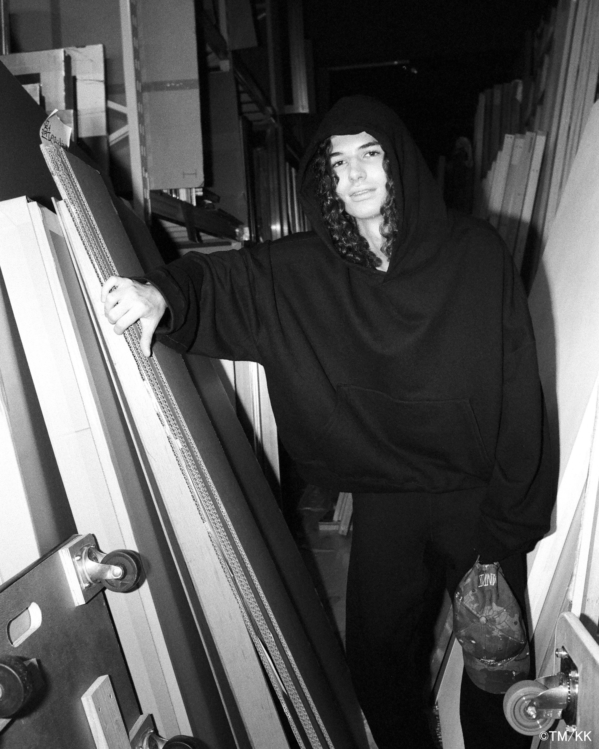 胸元には、Even If you Manage To Stay You Will Feel Like a Ghostのメッセージを配し、本コレクションのテーマである“生と死”を想起させる象徴的なディテールとして表現している。