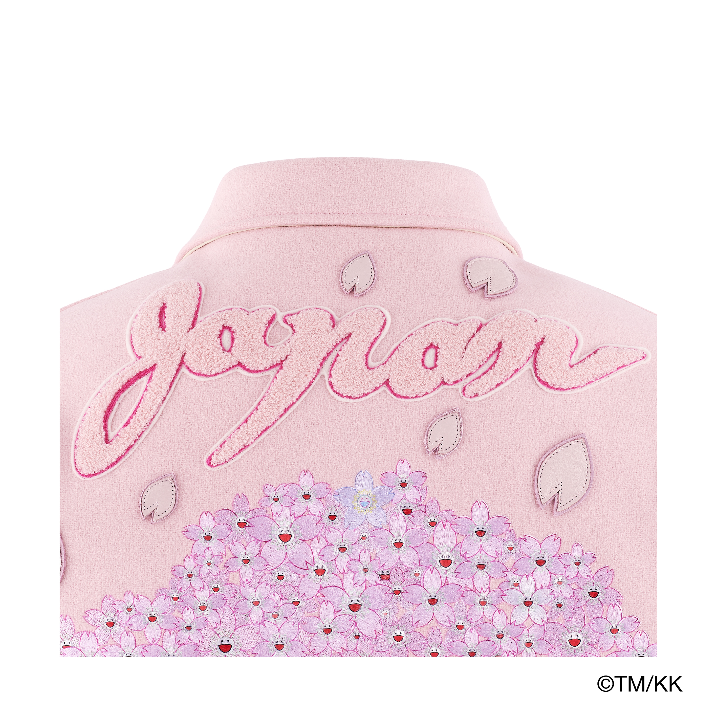 背面に配されたグラフィックは、花びら一枚一枚を分解し再構築した刺繍データをもとに、刺繍を5〜6層のレイヤーで重ねることで桜の奥行きを立体的に表現。さらに刺繍の上から精密に柄合わせを行った転写プリントを重ねることで、アートワークの繊細な色彩を再現している。刺繍の上に柄をずらさずプリントを重ねる高度な技術が求められ、刺繍工程だけでも10回以上の試作を経て完成した。刺繍はアパレルのプロダクトとしては異例ともいえる2万針を超える密度で施されており、1日に1着しか製作できない極めて手間のかかった仕様となっている。