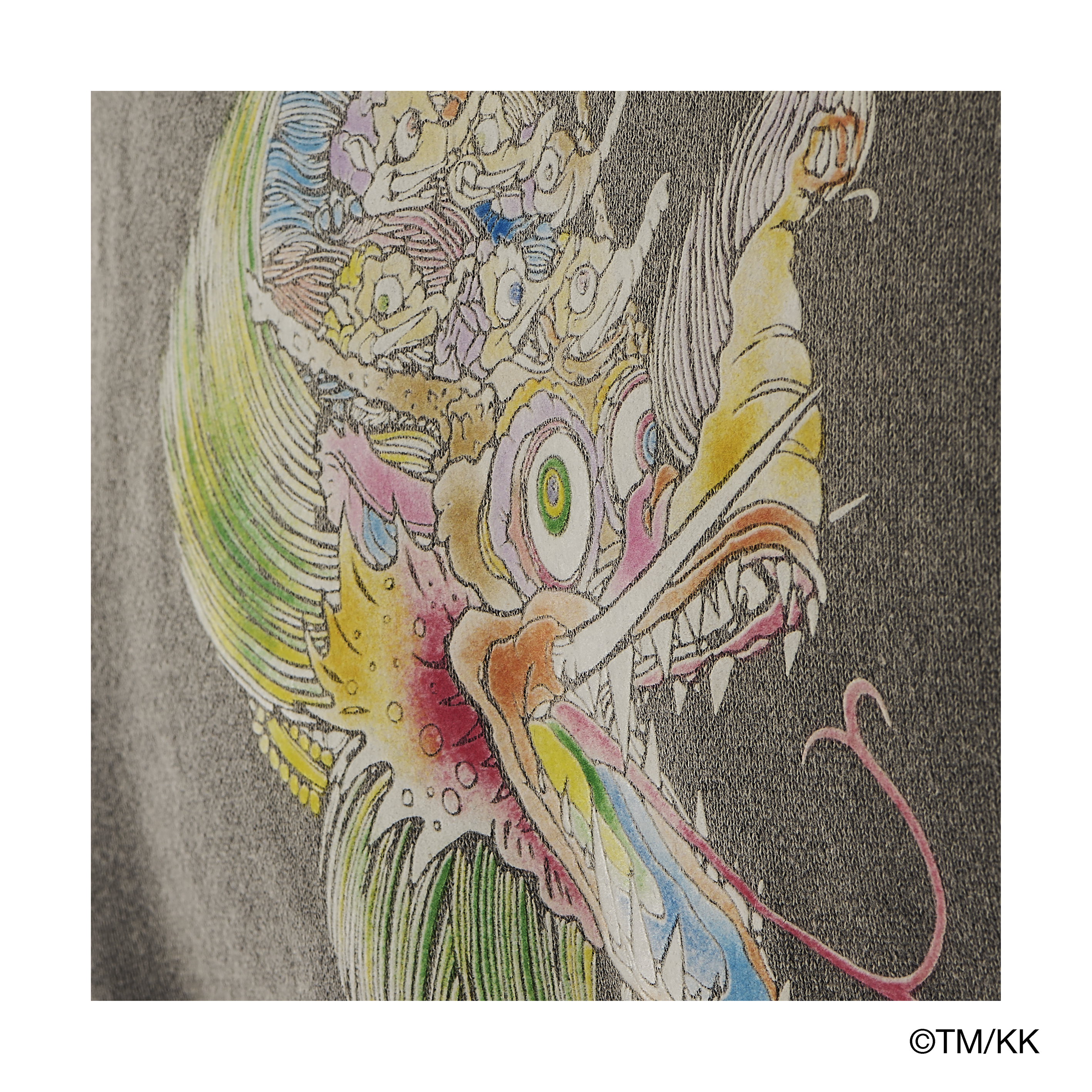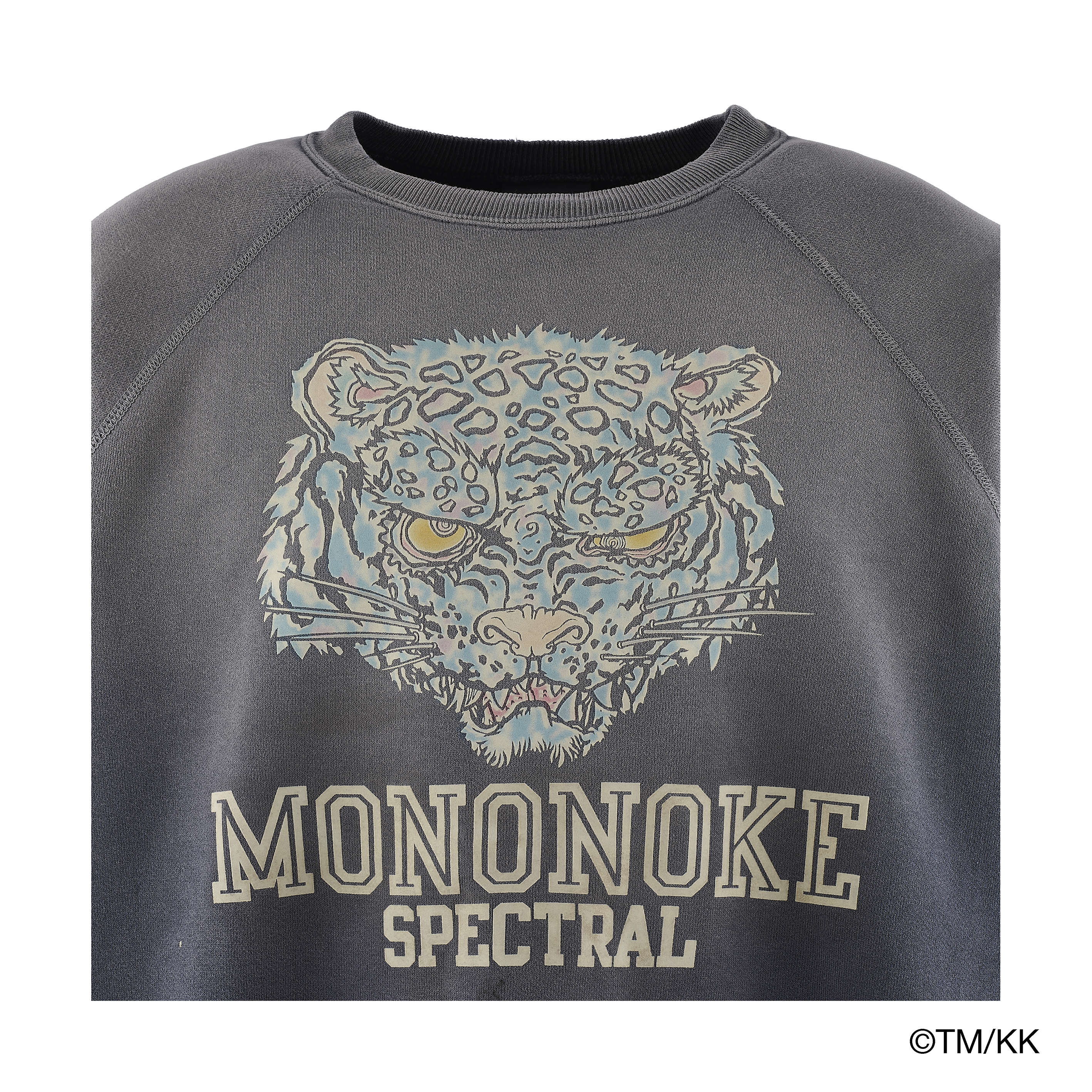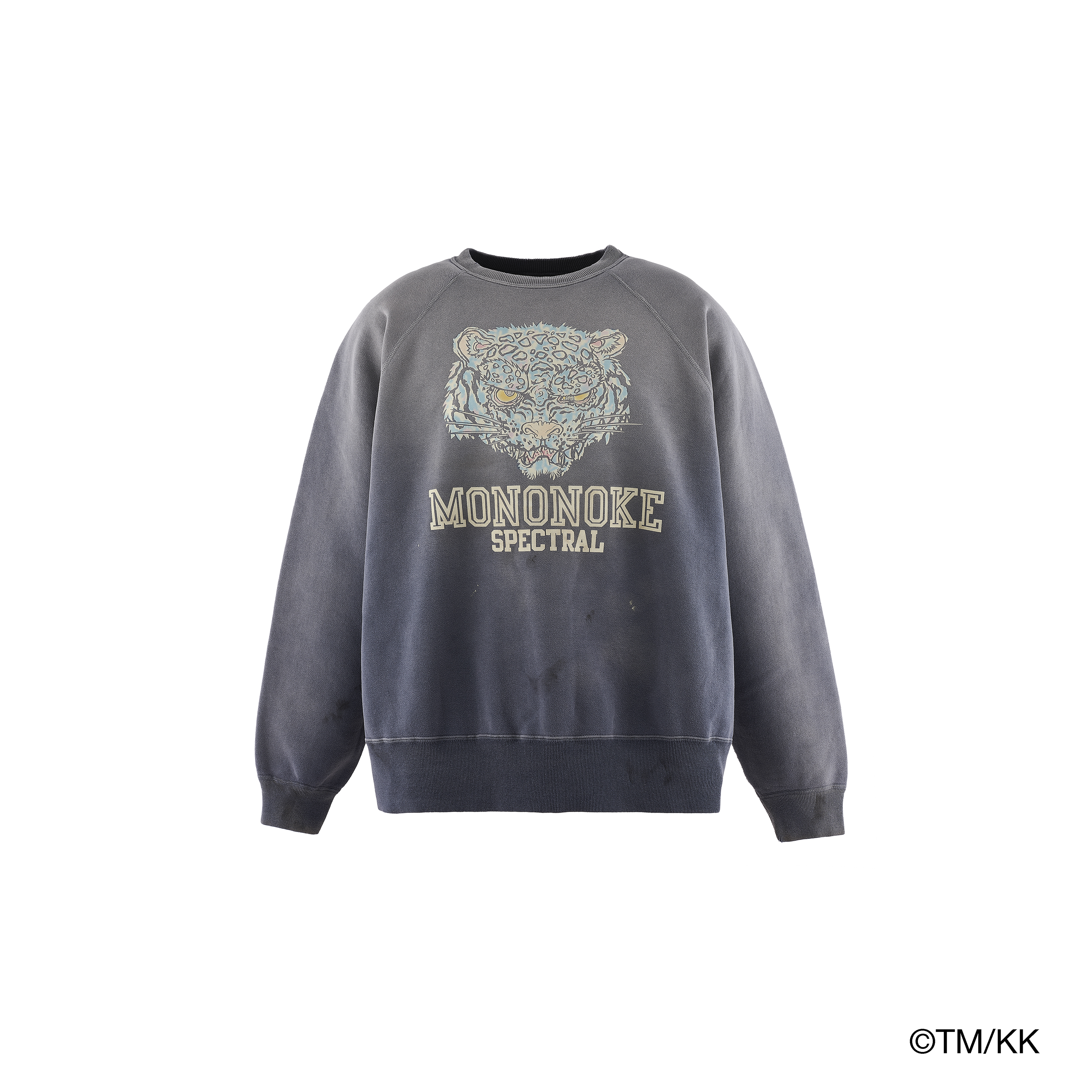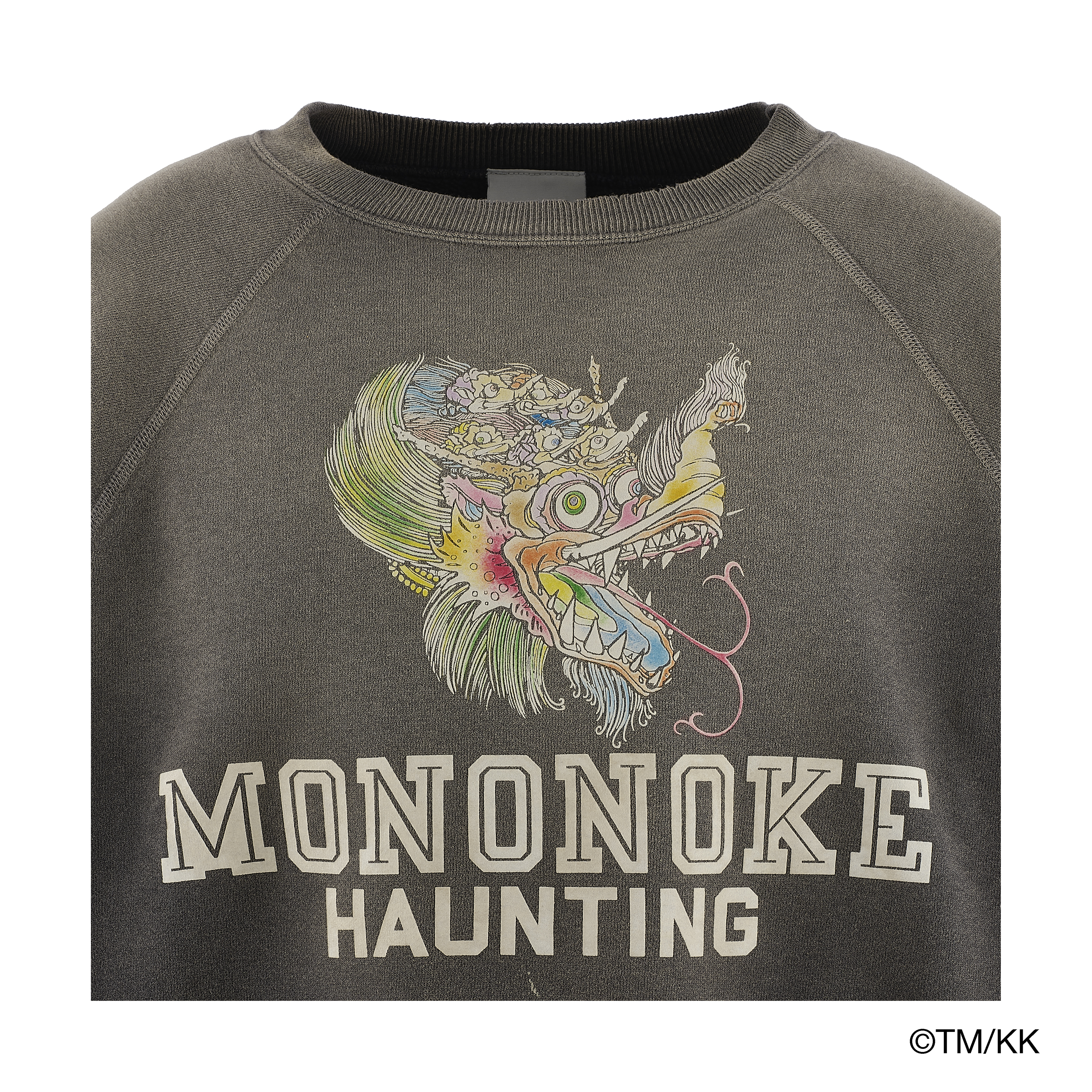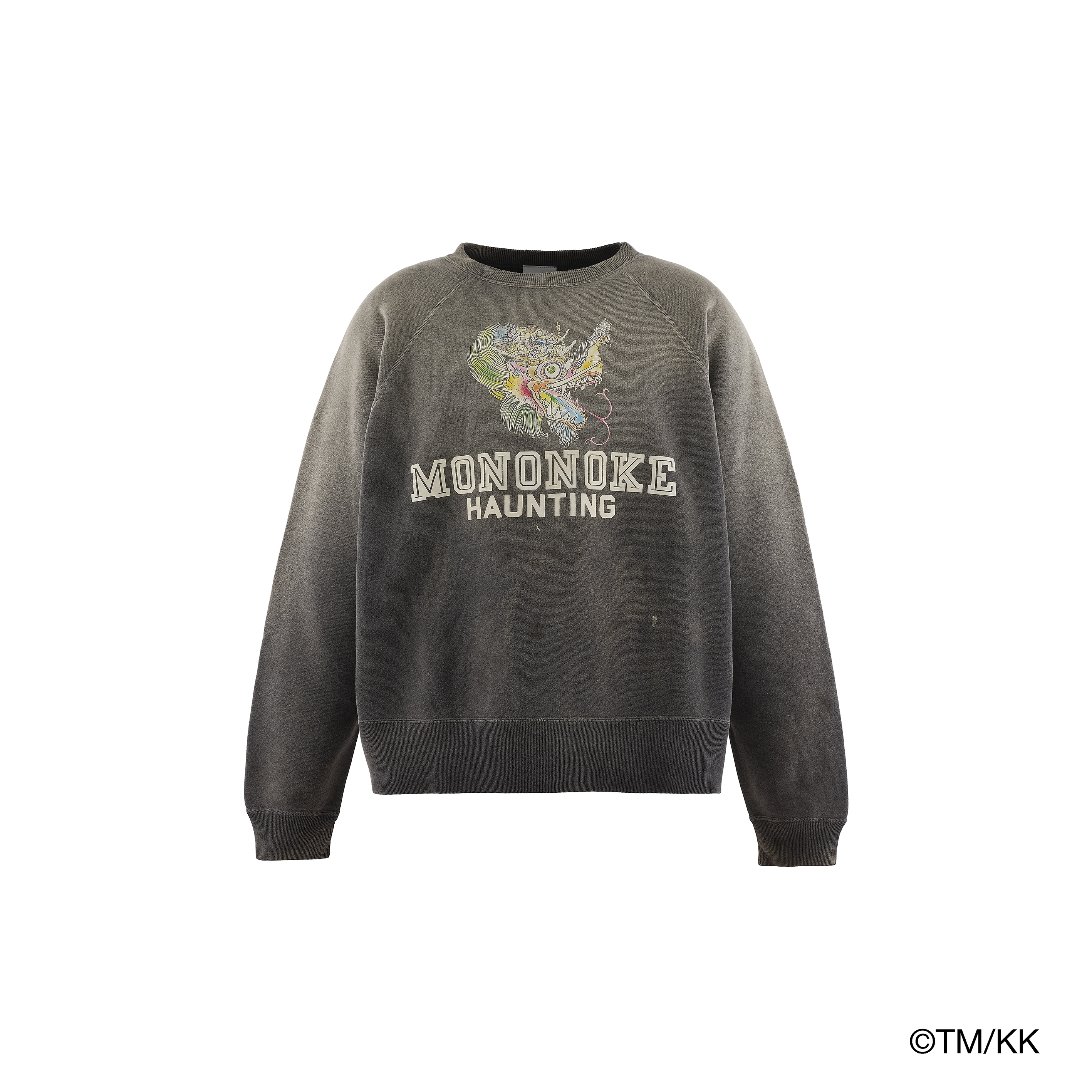 ダブルフェイス素材を採用したクルーネックスウェット。アートワークの質感を際立たせるため、フロッキープリントとシルクスクリーンプリントを組み合わせ、繊細な色のニュアンスまで丁寧に表現している。さらに、細川氏が得意とする本格的なヴィンテージ加工を施すことで、奥行きのあるアート表現と豊かな風合いを兼ね備えた一着に仕上げている。