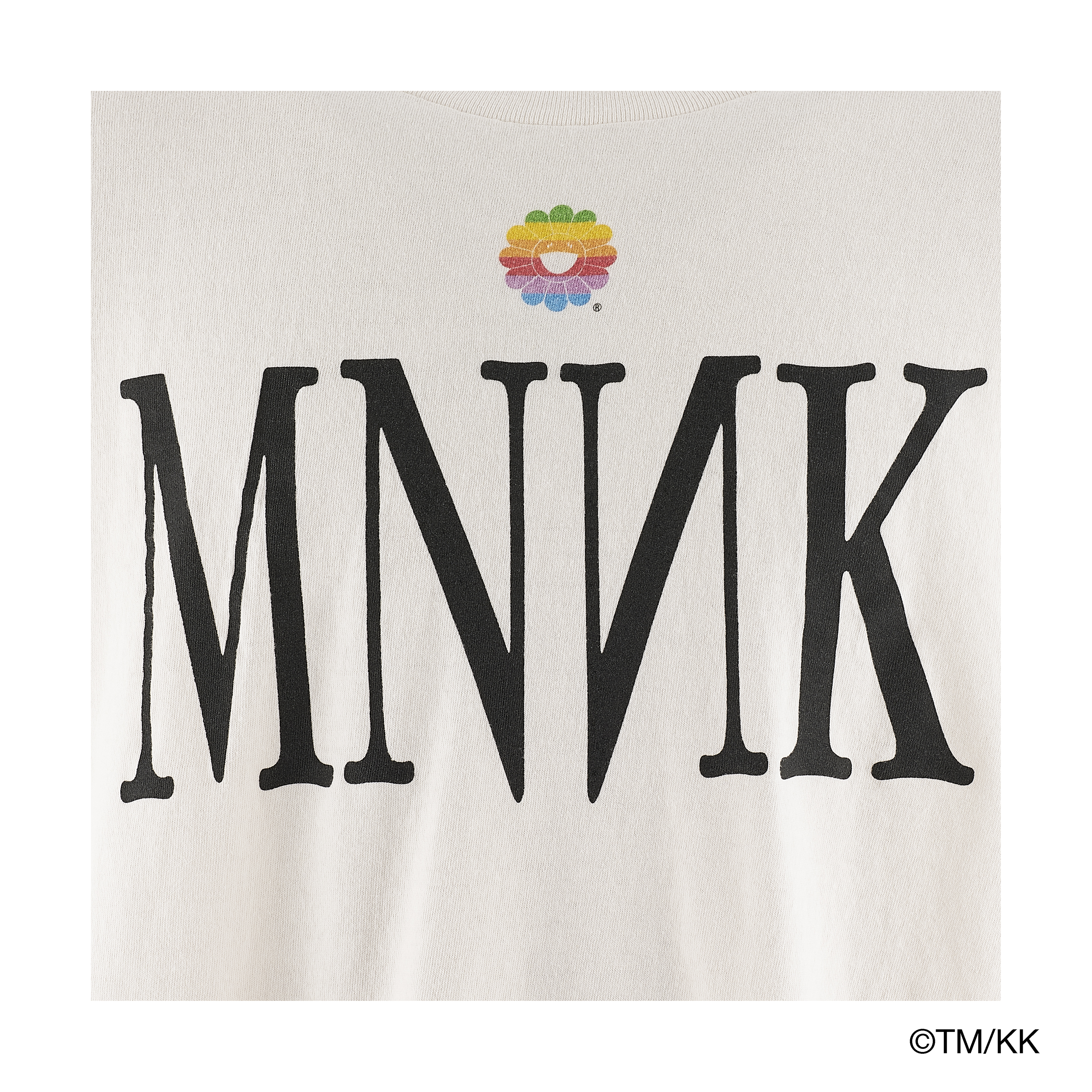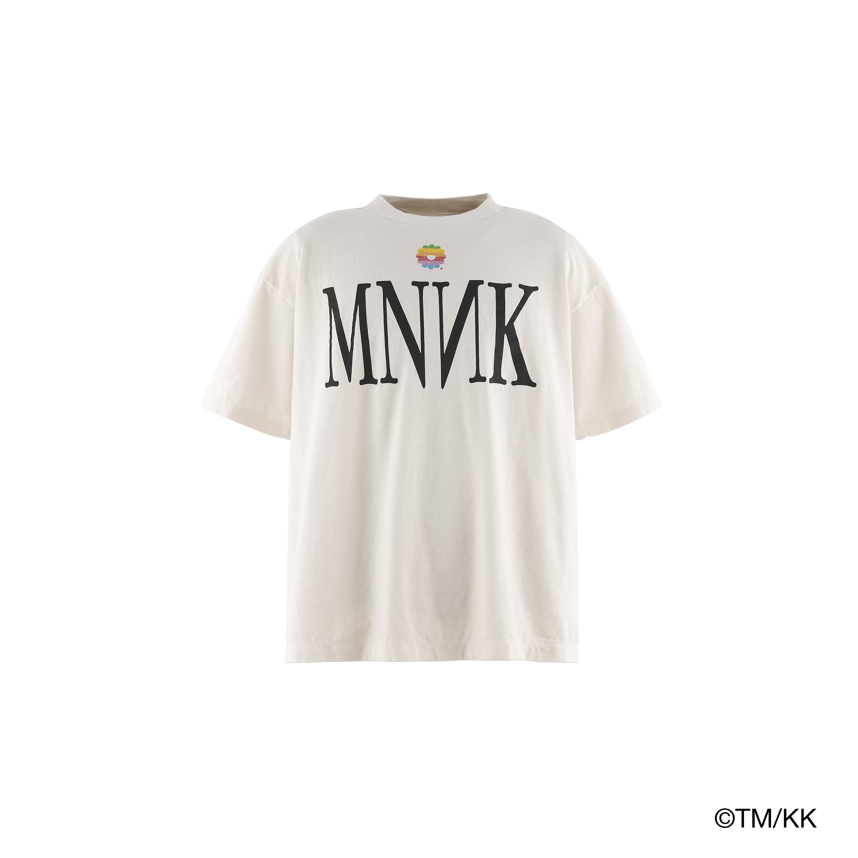 細川氏が開発したオリジナルボディを採用したTシャツ。ブランド名を象徴する「MNNK」と、レインボーカラーで表現した「お花」のモチーフをグラフィックとして配している。仕上げに、細川氏が得意とするヴィンテージ加工を施すことで、奥行きのある風合いと存在感を備えた一着に仕上げている。