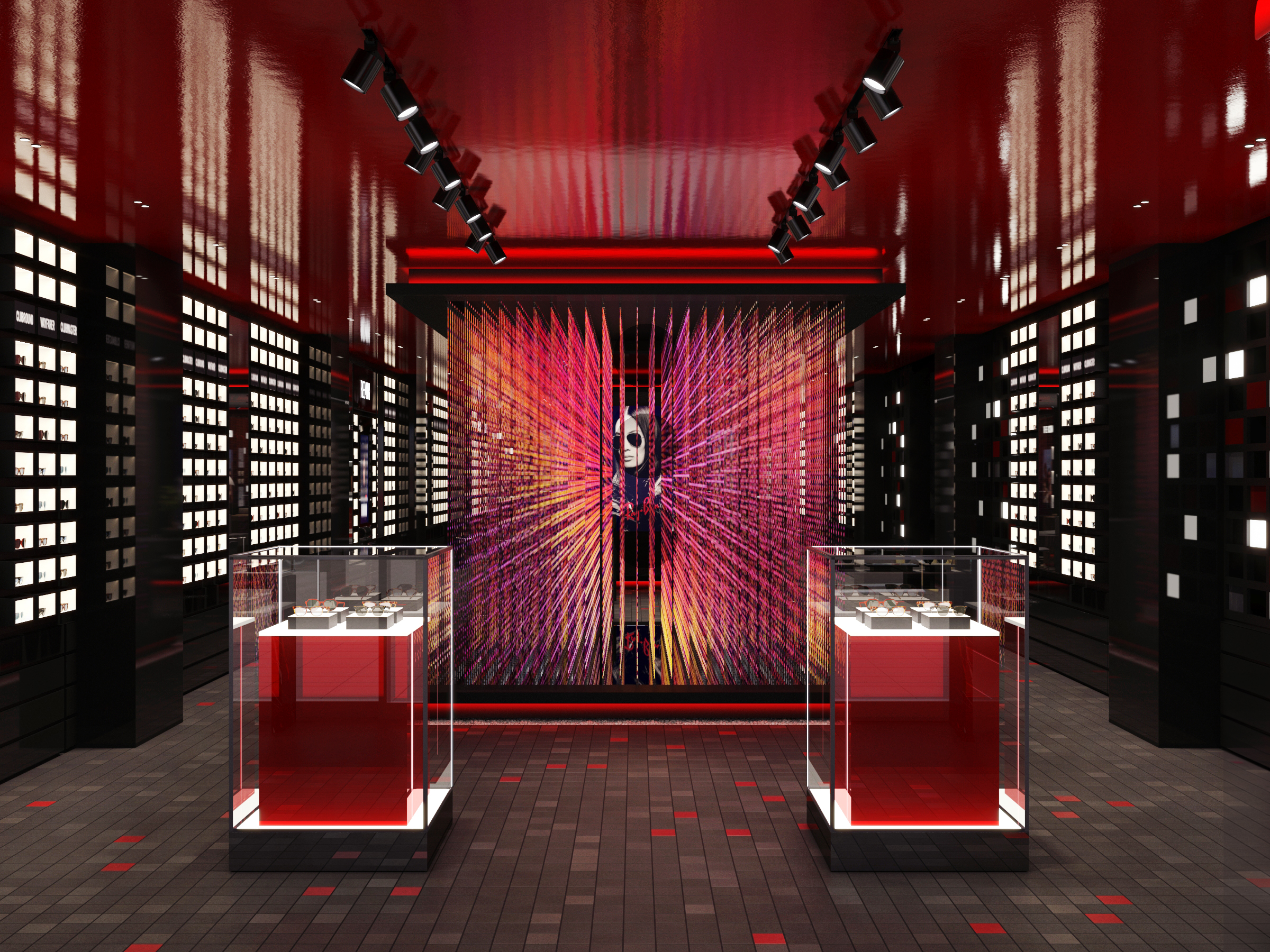 また、エントランス付近には数百本のLEDフィラメントで構成された壮大なデジタルインタスタレーションが設置され、ダイナミックで没入感のある演出が来店した方々を迎える。