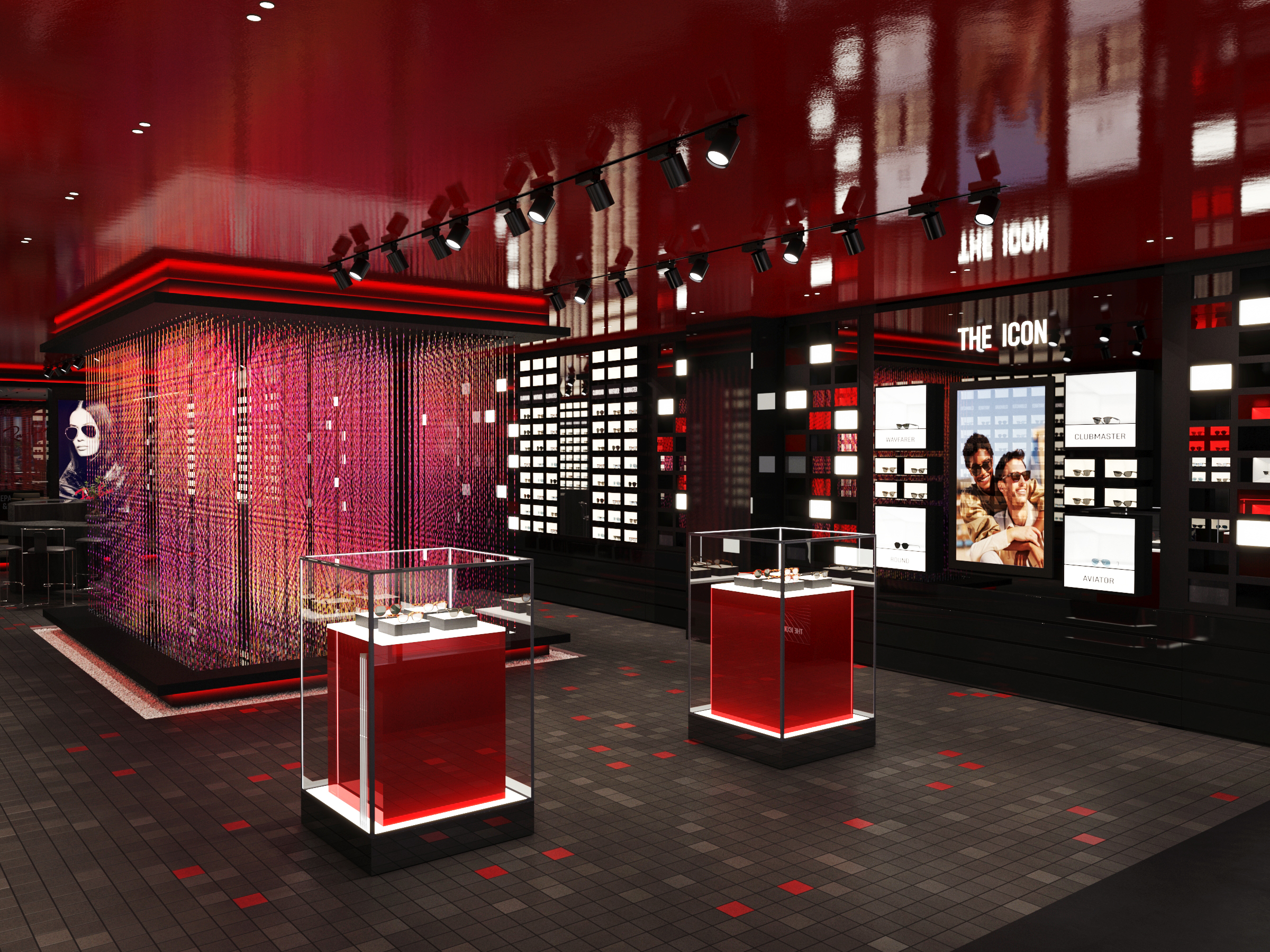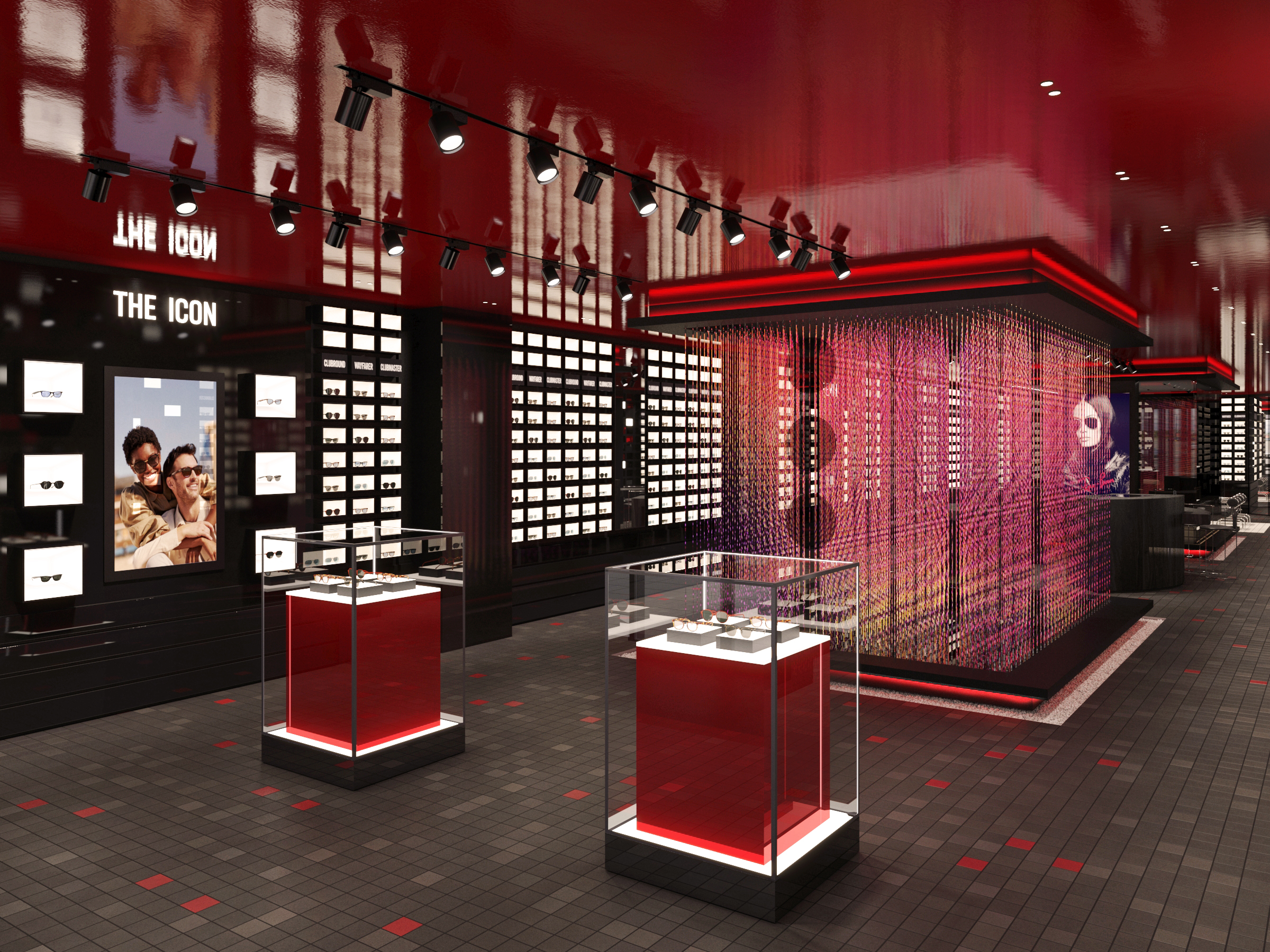 国内最大級の面積となる店内には約1000本のアイウェアが、精密な幾何学模様で彩られたガラスの什器で壁一面にディスプレイされ、アイコンから新作コレクション、キッズやオプティカルコレクションまでフルラインナップが揃う。