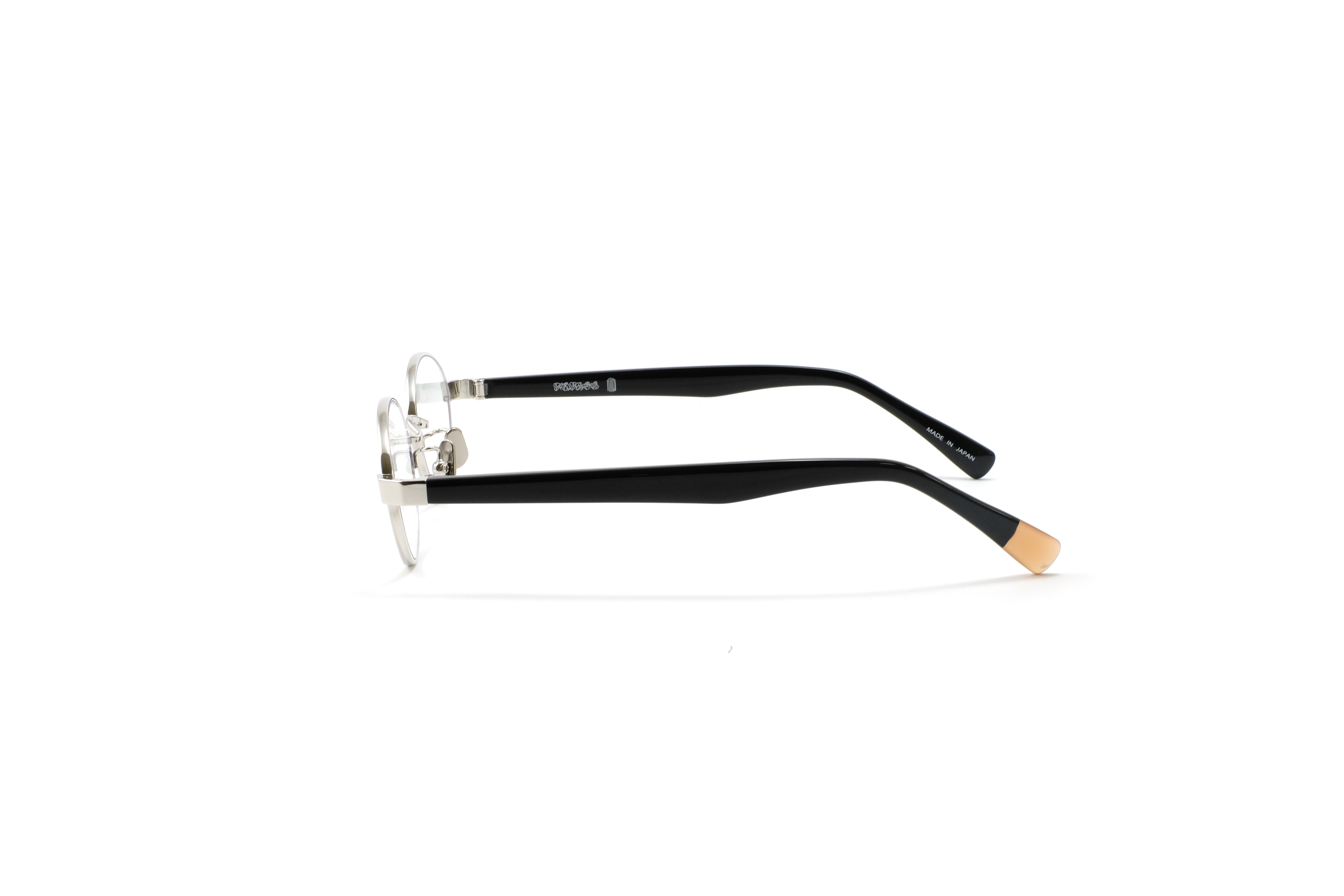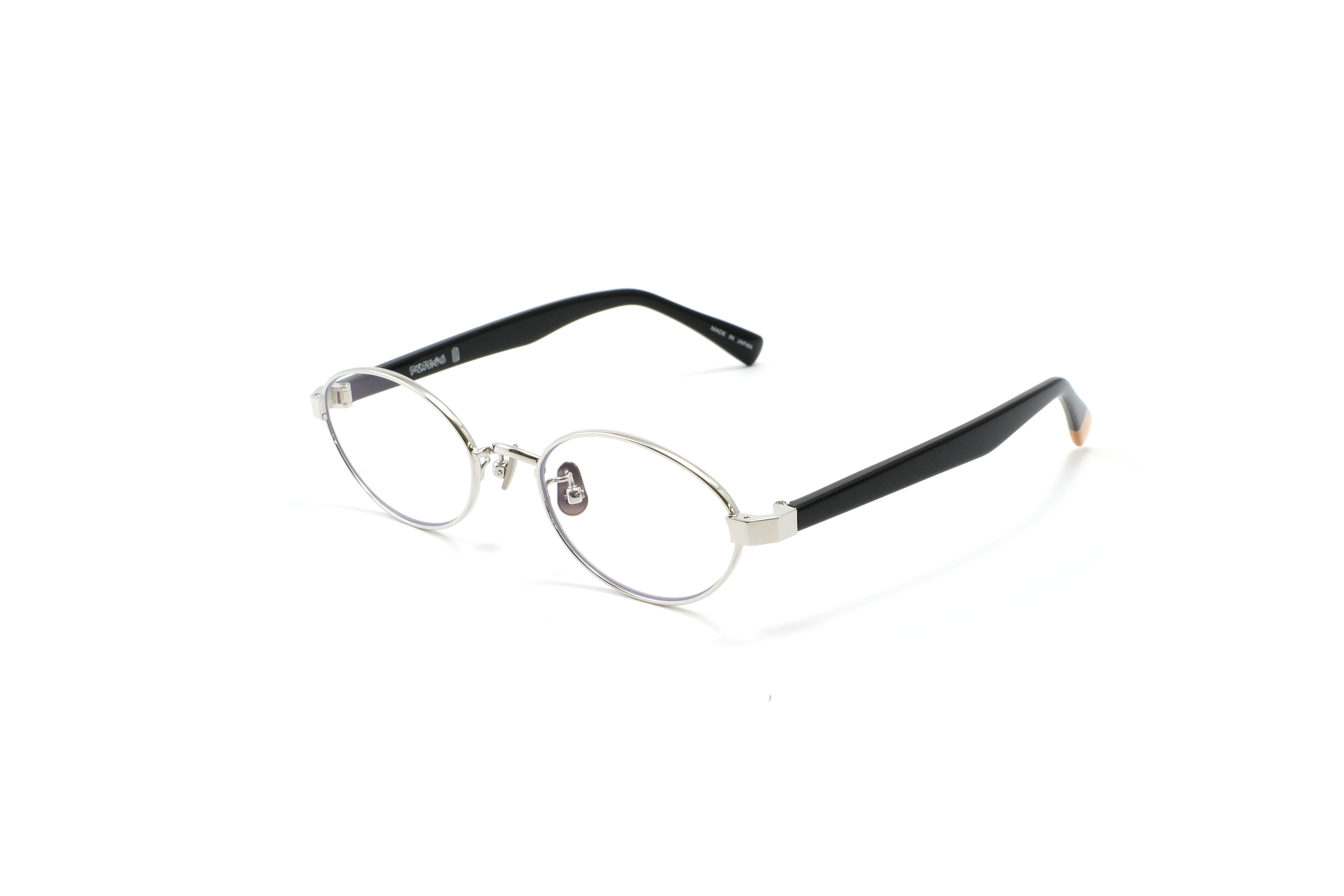 クリーンなシルバーメタルのフロントに、ブラックのアセテートテンプルを組み合わせたカラー。コントラストが際立ち、知的でシャープな印象を引き出します。スタイリングを引き締めるモードなカラーリングです。