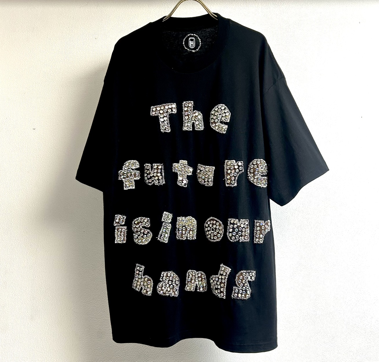 ブランドロゴをハンドプリントしてから、洋服一点一点に手縫いで縫い付ける工程は、ANTIでも行っている時間と思いを注ぎ込む山崎氏のクリエイションの本質。