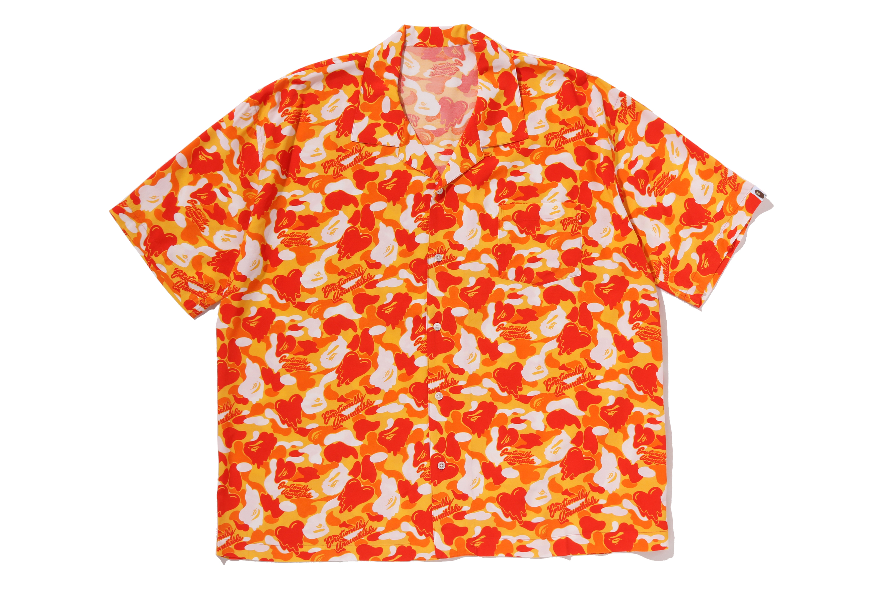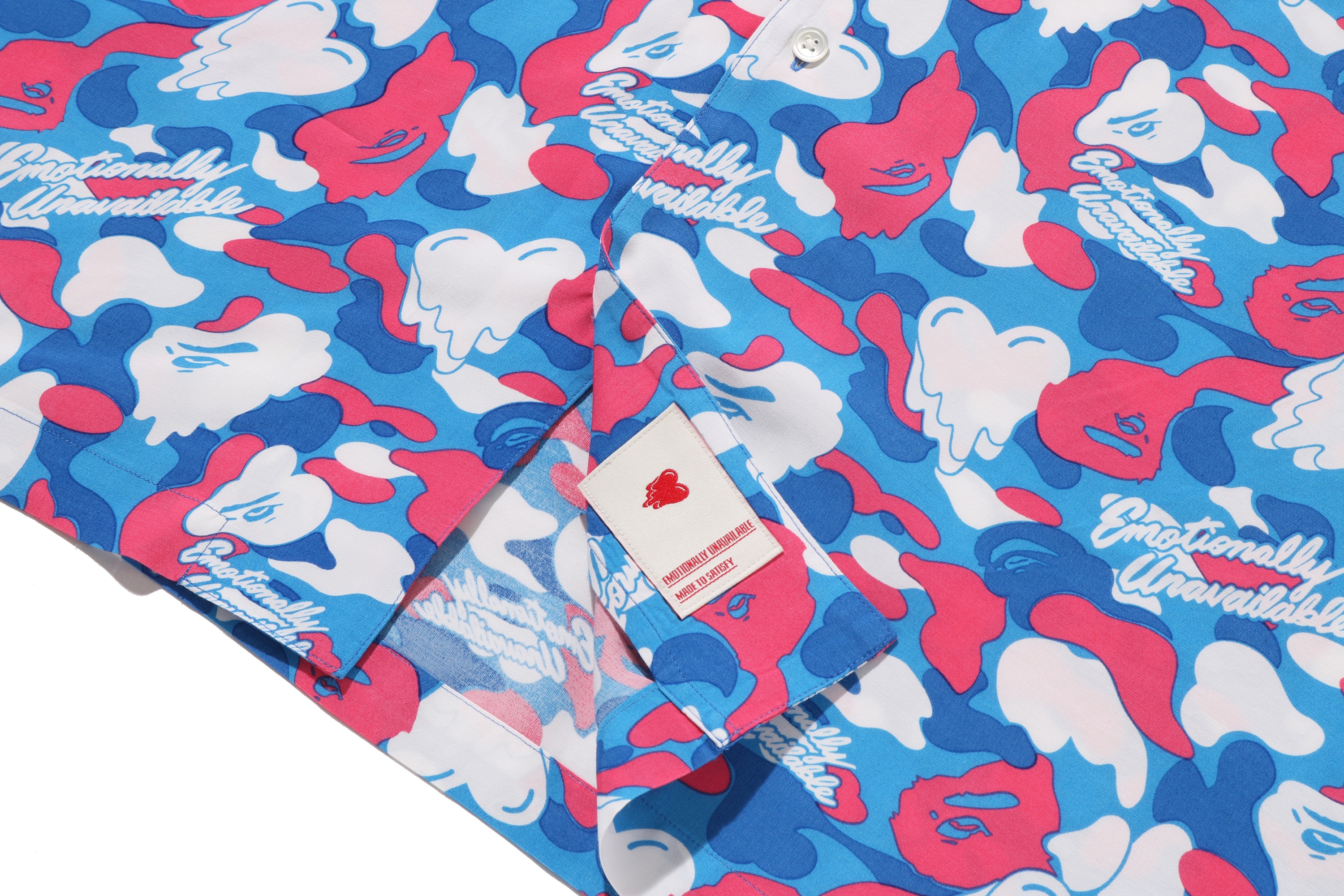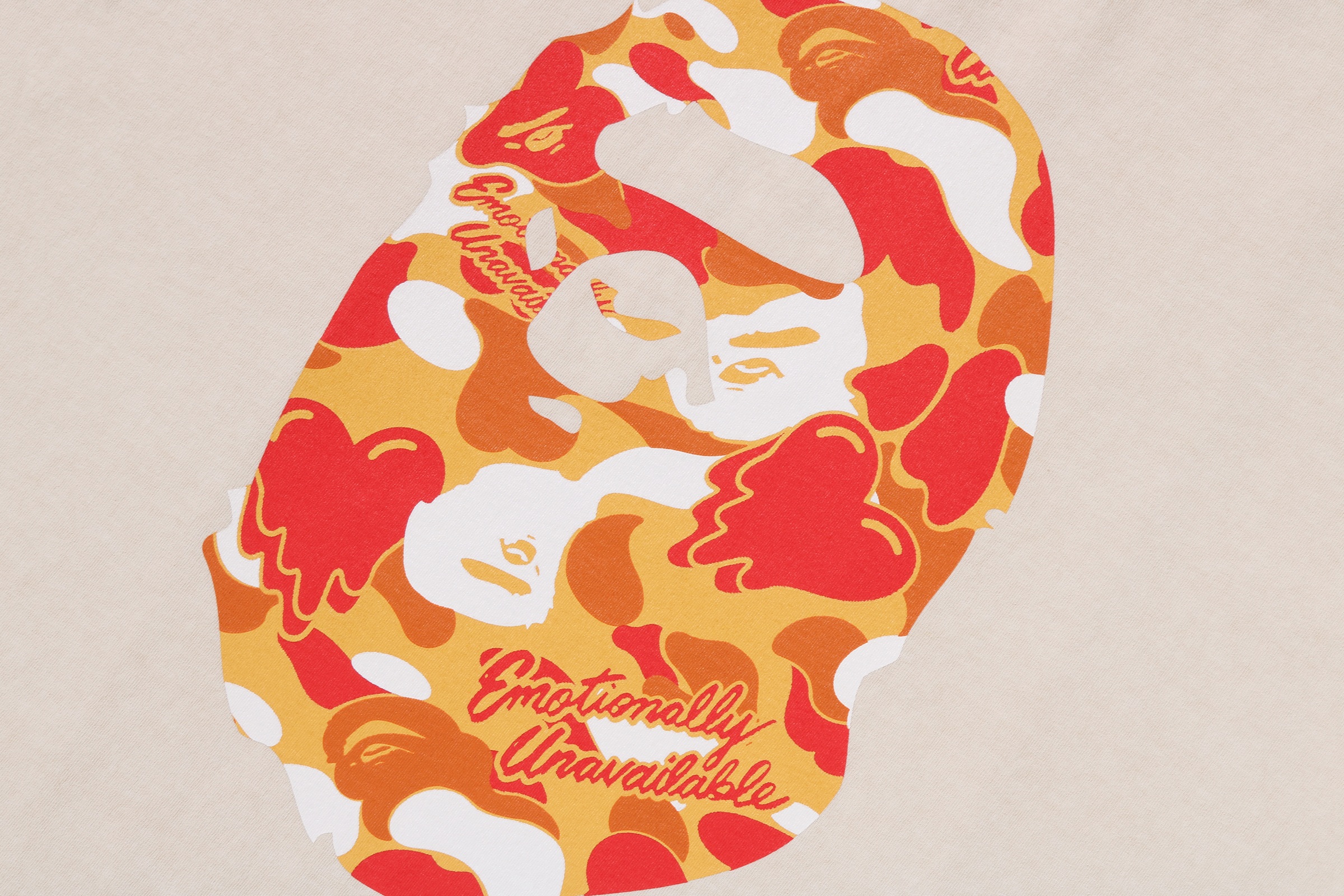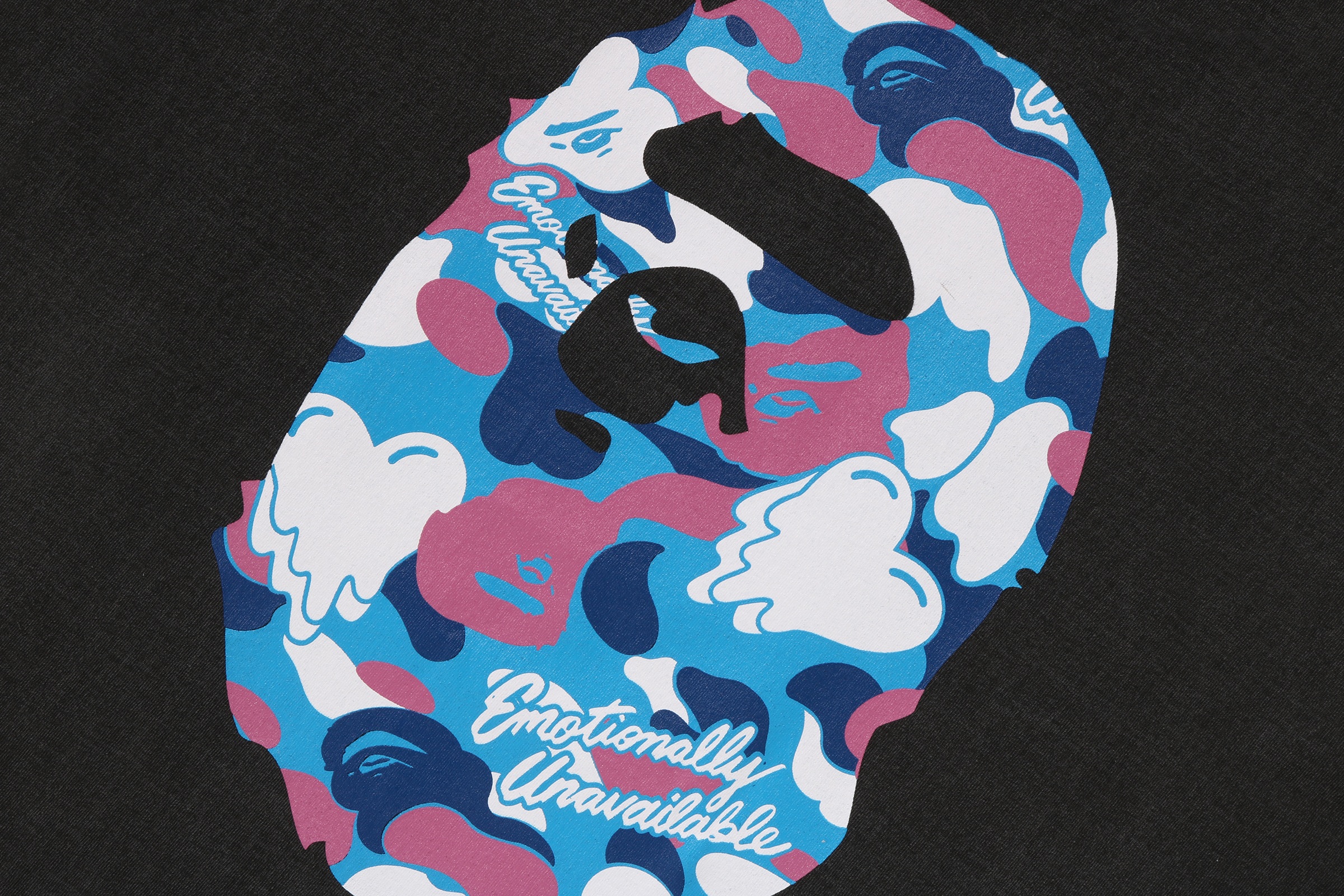 BAPE®︎のシグネチャーであるBAPE®︎ CAMOに、EMOTIONALLY UNAVAILABLEのロゴとハートモチーフを組み合わせ、滴る雫のようなグラフィックで再構築したオリジナルカモ柄が特徴。