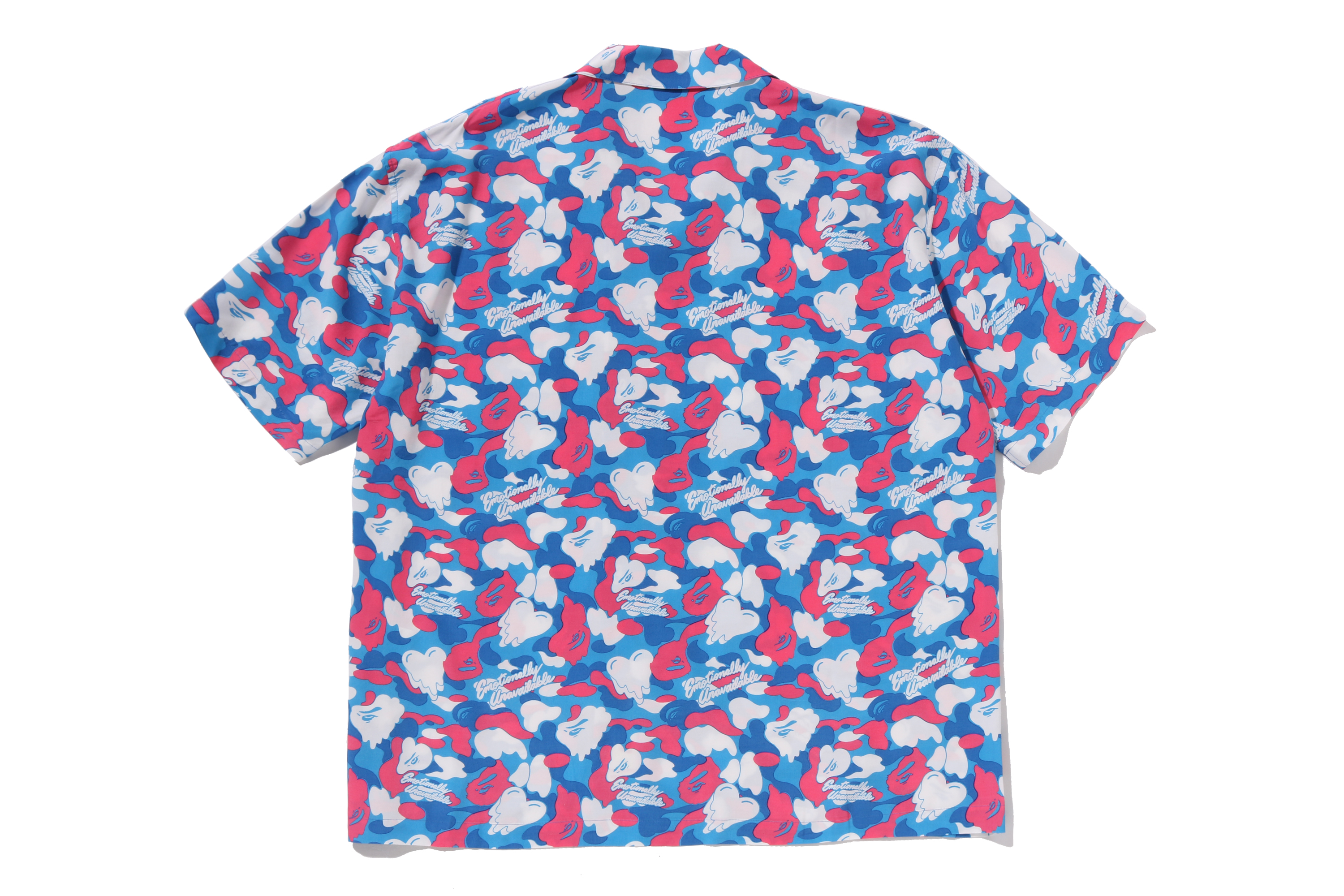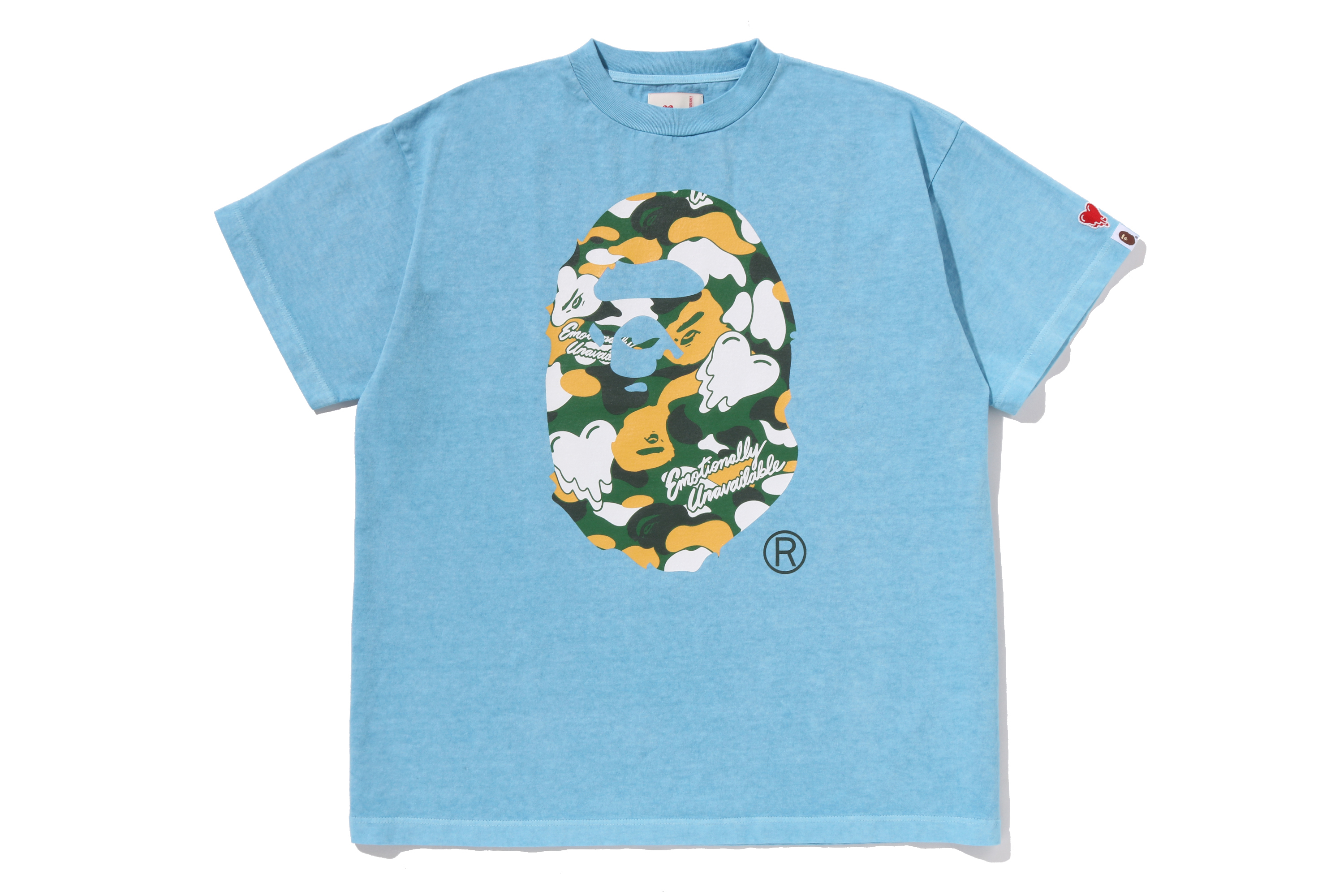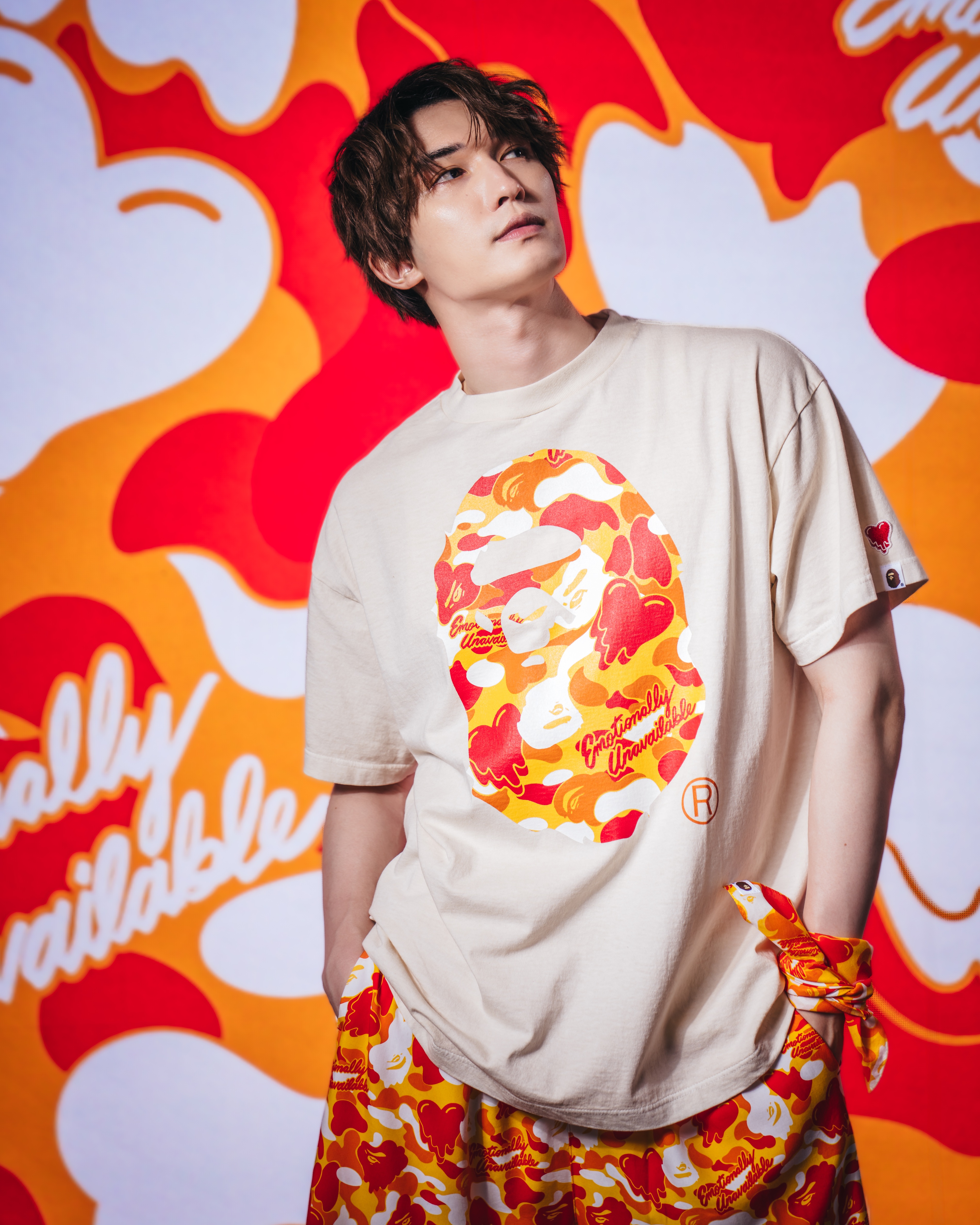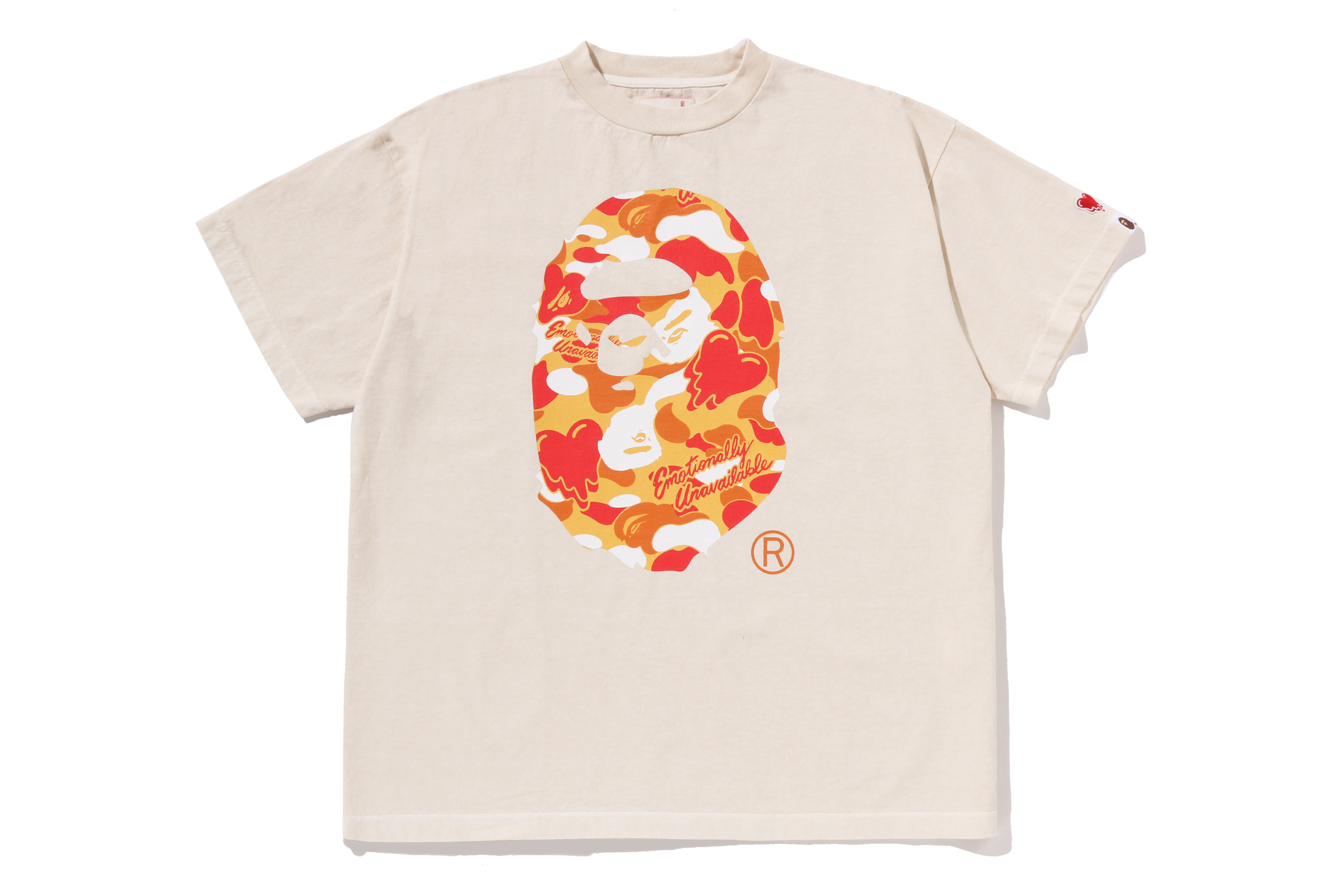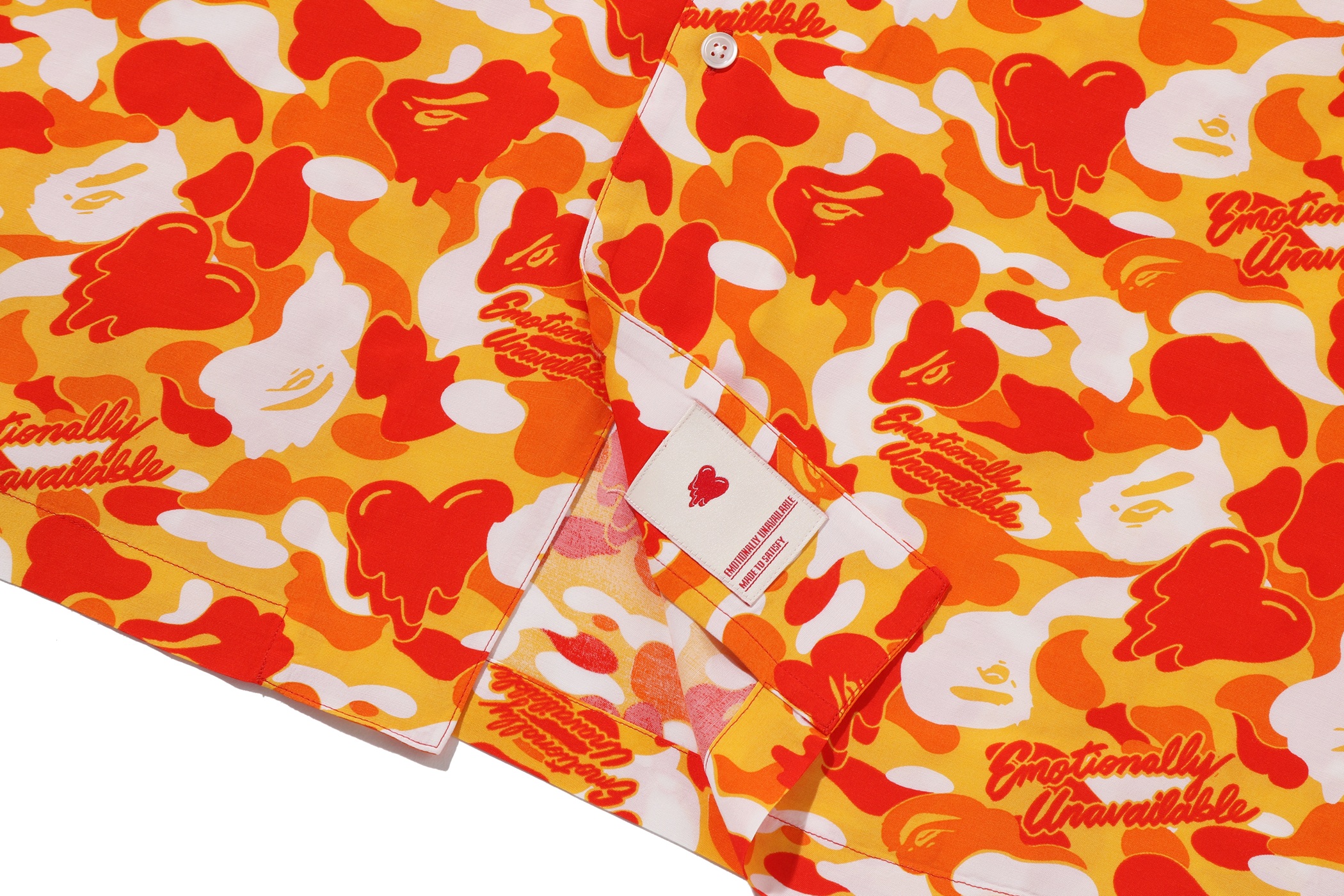 BAPE®︎のシグネチャーであるBAPE®︎ CAMOに、EMOTIONALLY UNAVAILABLEのロゴとハートモチーフを組み合わせ、滴る雫のようなグラフィックで再構築したオリジナルカモ柄が特徴。