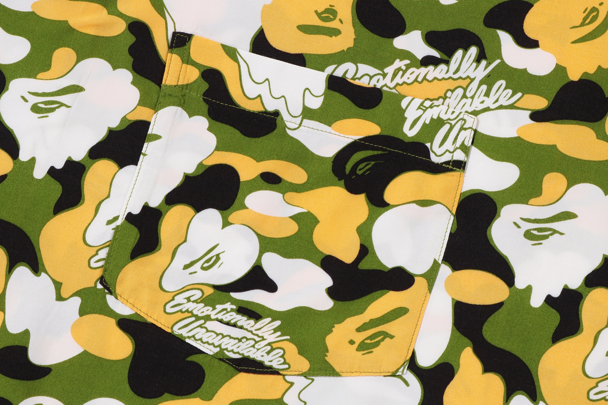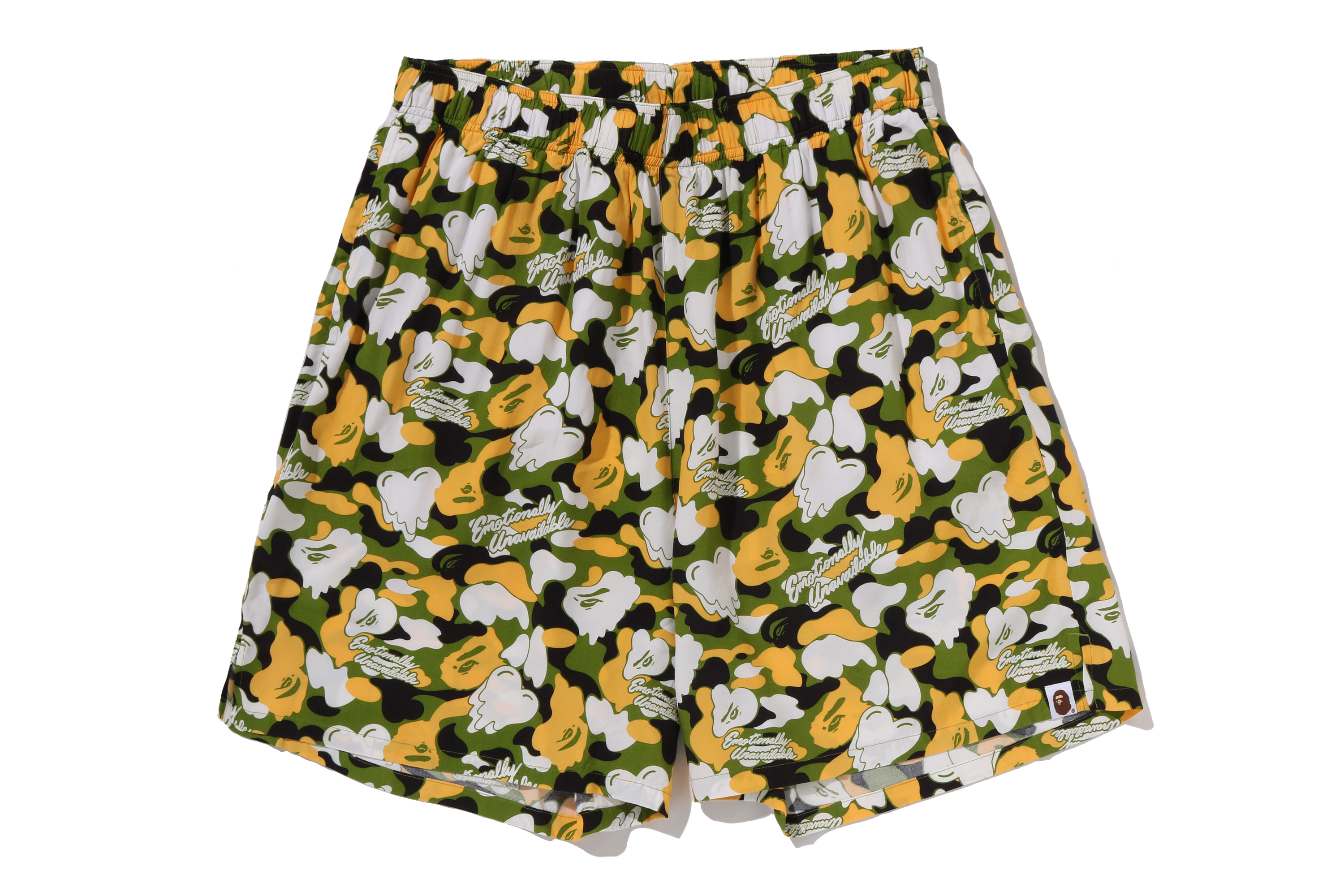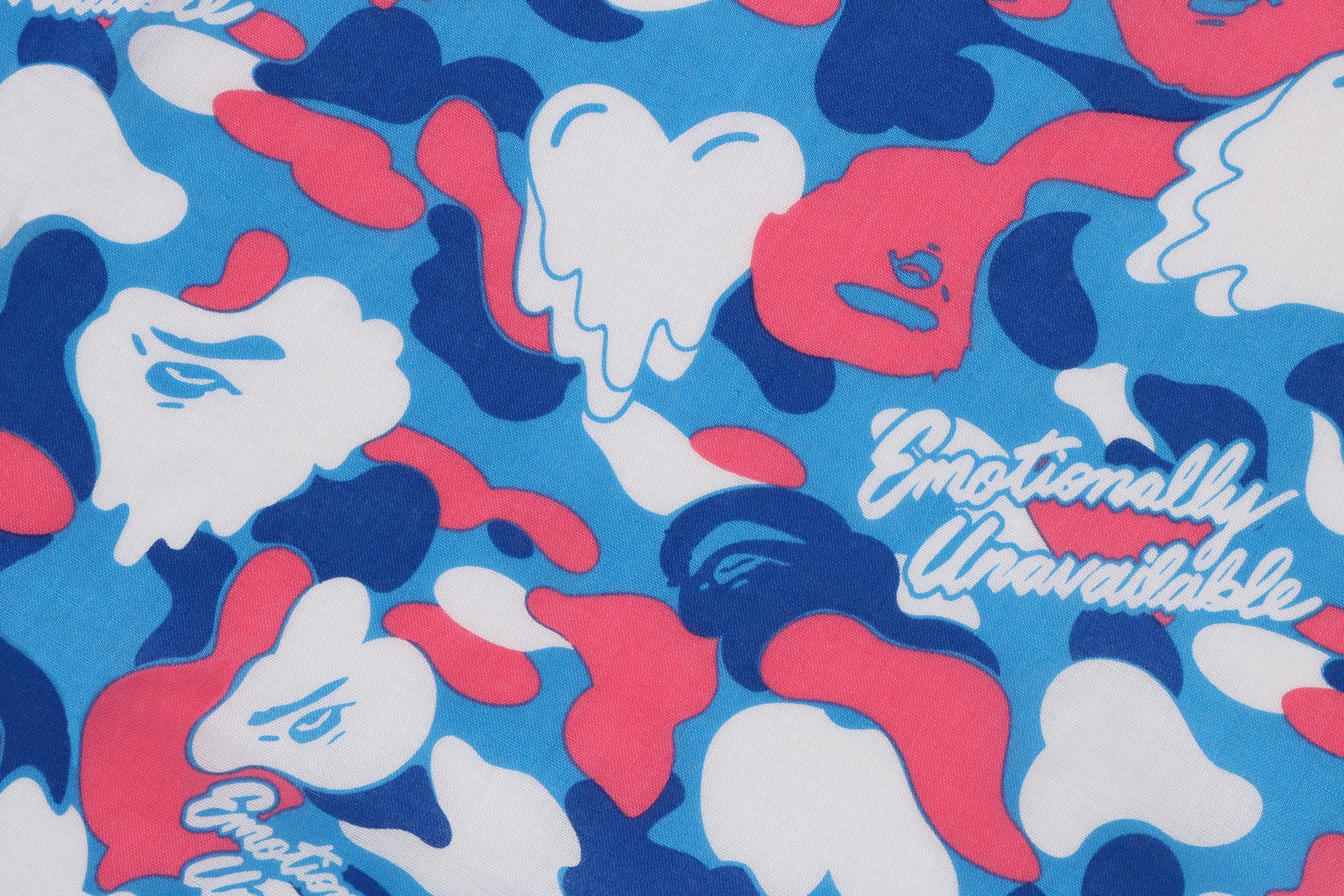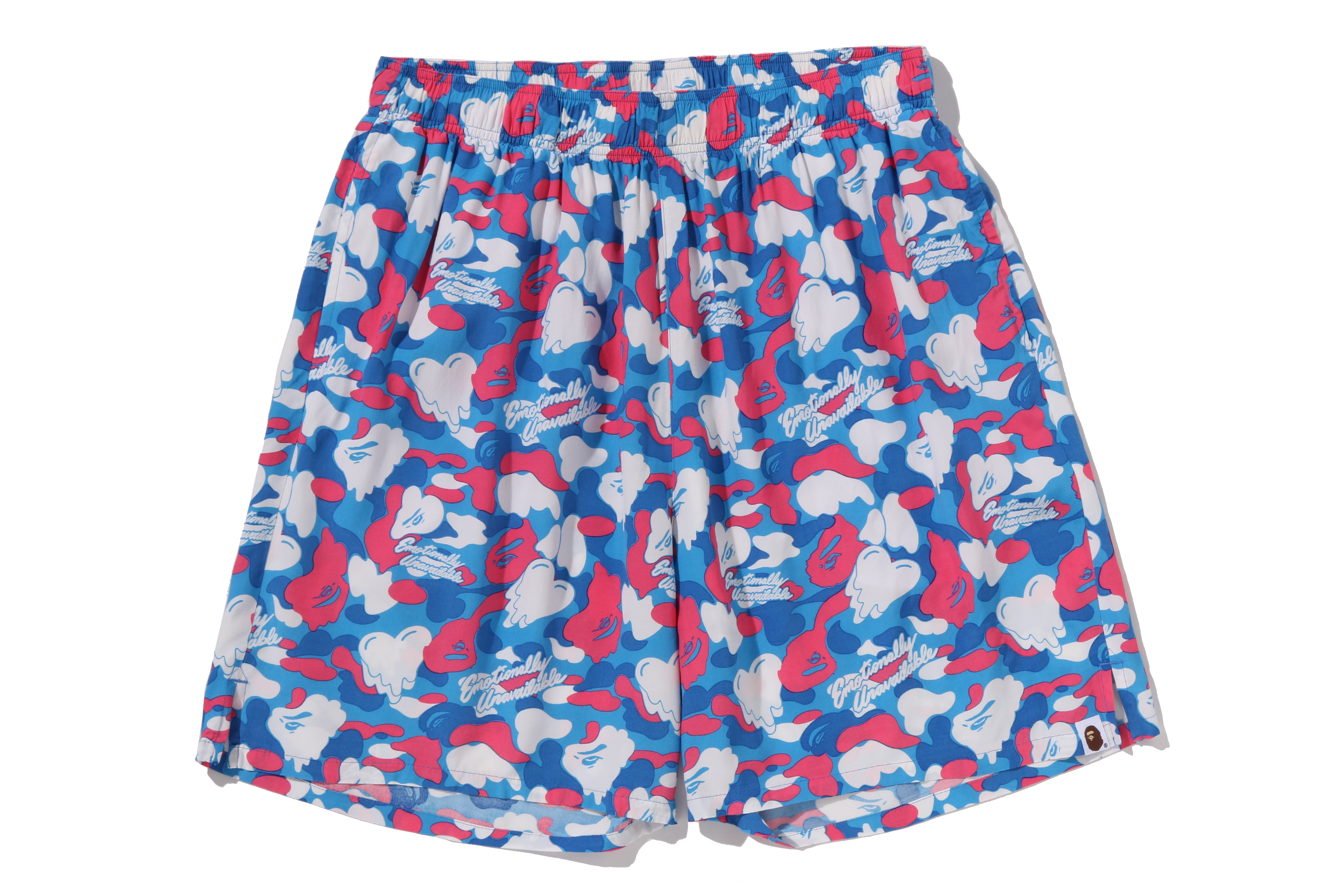 BAPE®︎のシグネチャーであるBAPE®︎ CAMOに、EMOTIONALLY UNAVAILABLEのロゴとハートモチーフを組み合わせ、滴る雫のようなグラフィックで再構築したオリジナルカモ柄が特徴。