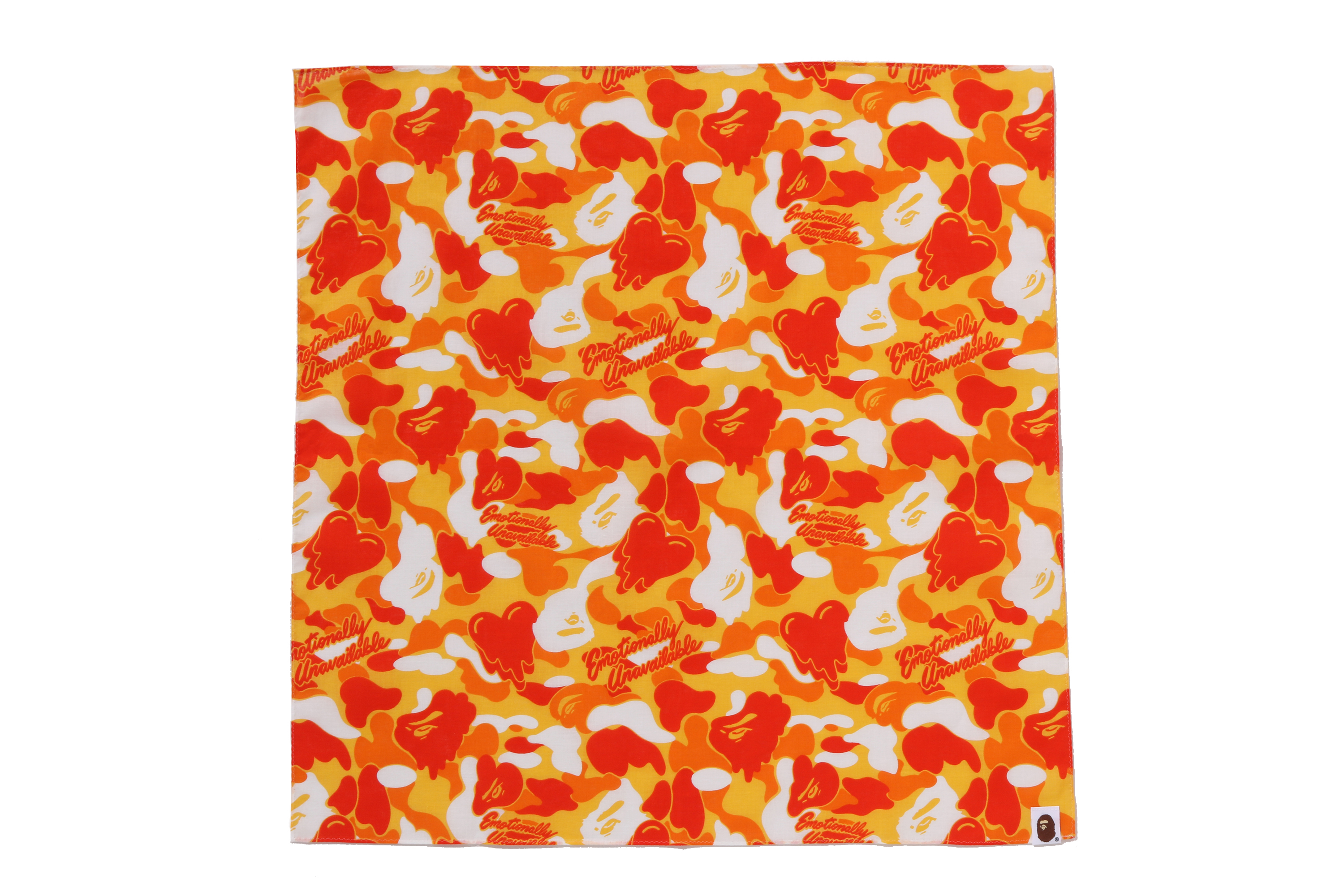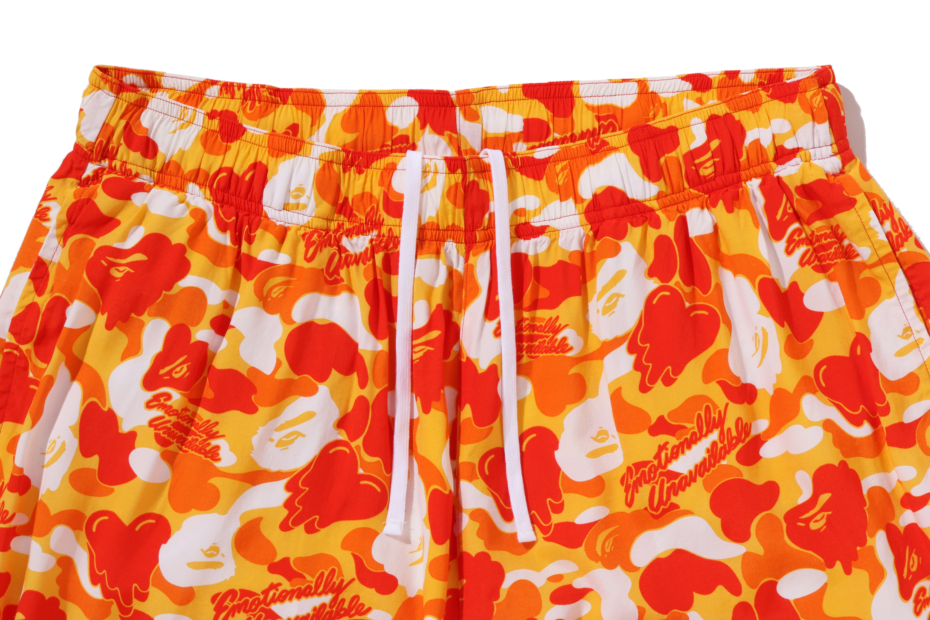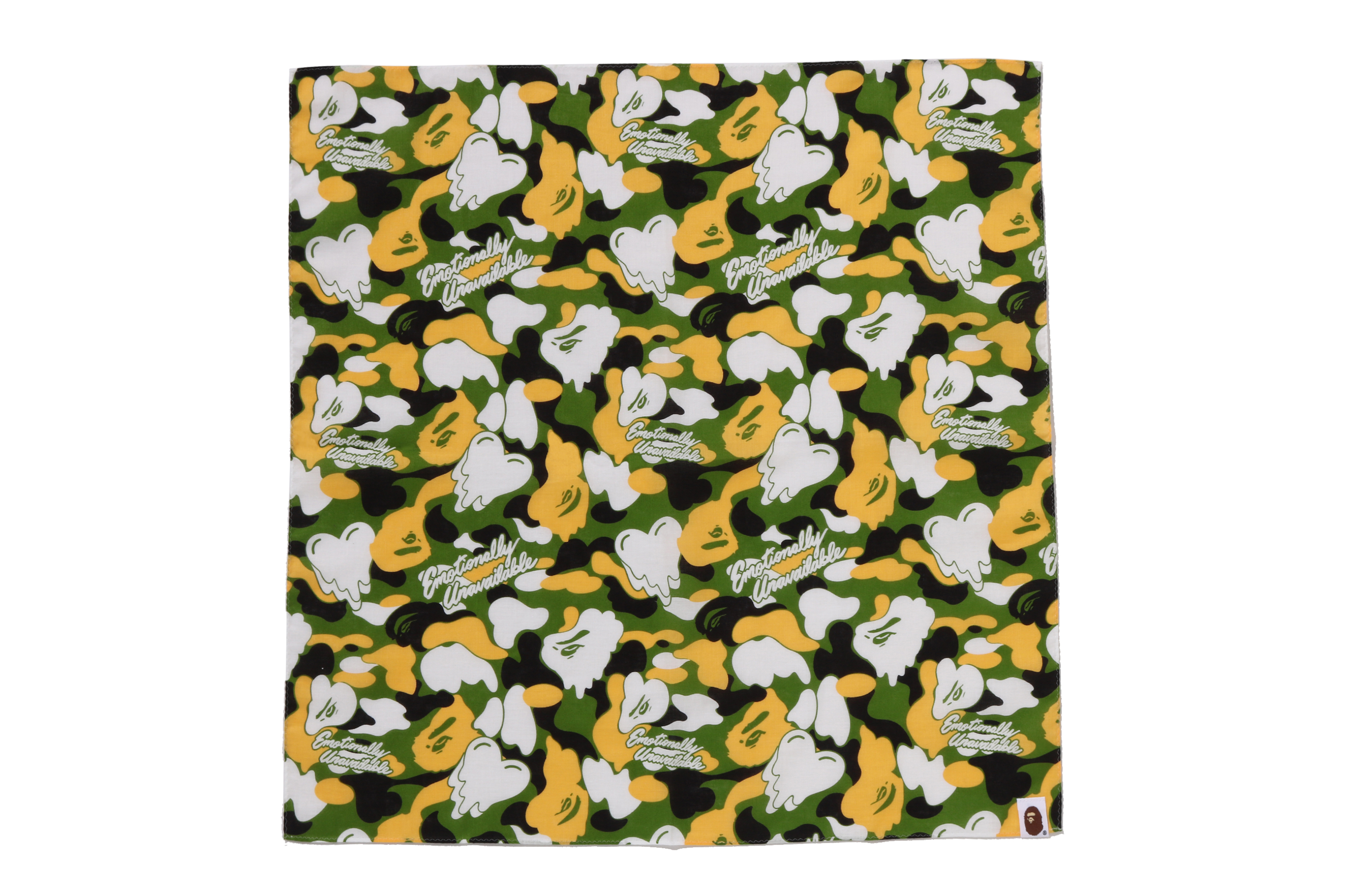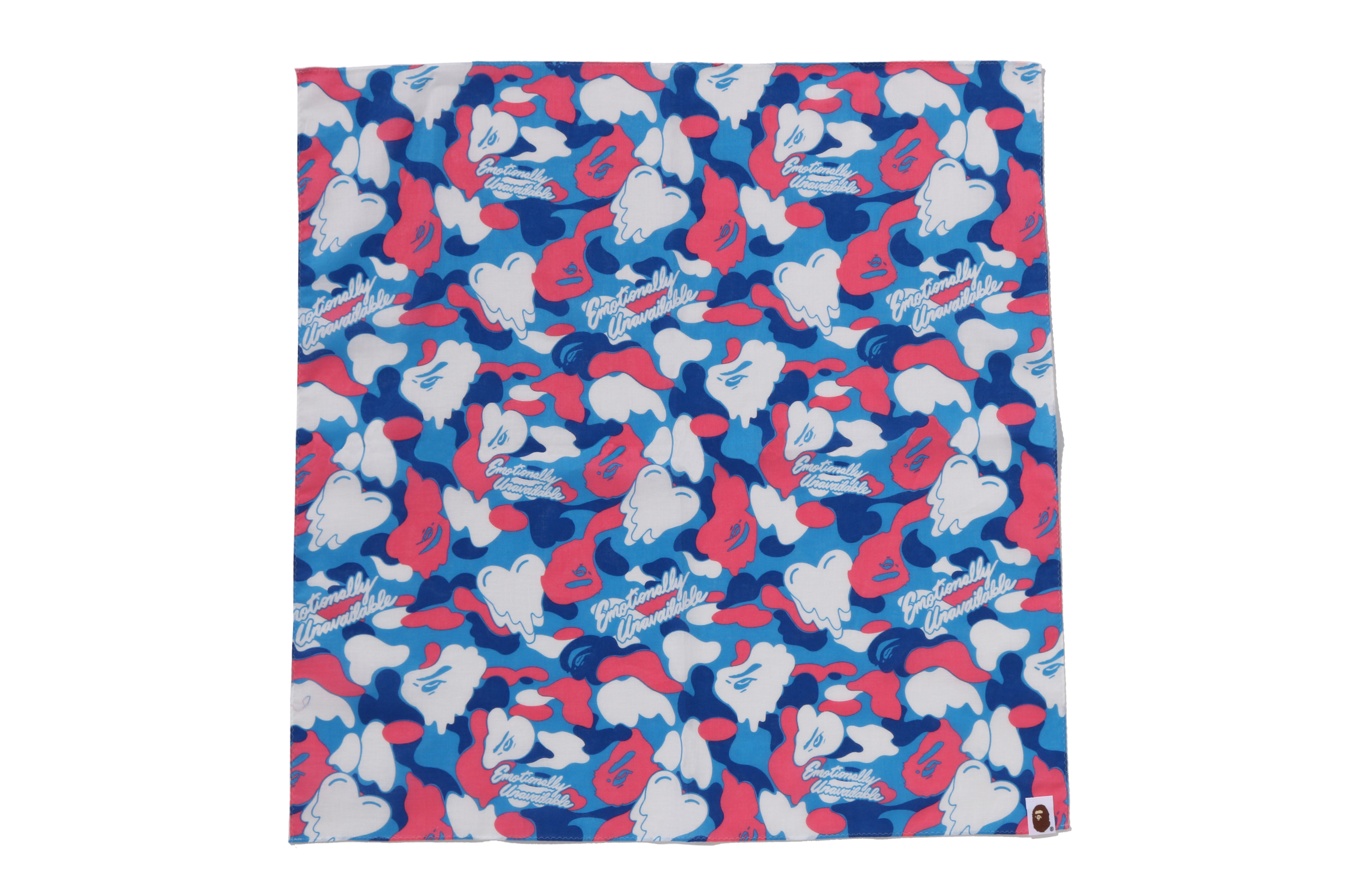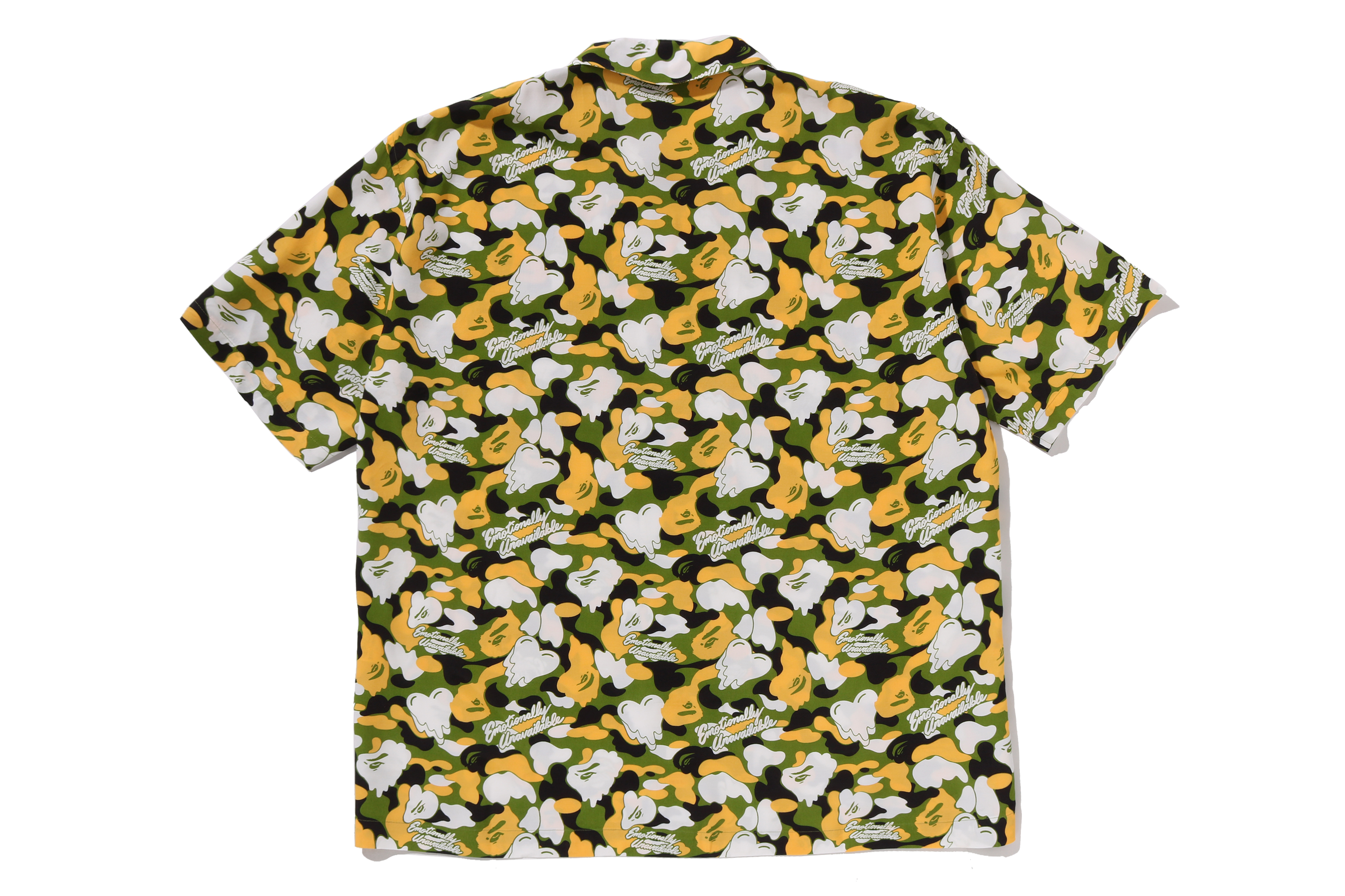 BAPE®︎のシグネチャーであるBAPE®︎ CAMOに、EMOTIONALLY UNAVAILABLEのロゴとハートモチーフを組み合わせ、滴る雫のようなグラフィックで再構築したオリジナルカモ柄が特徴。