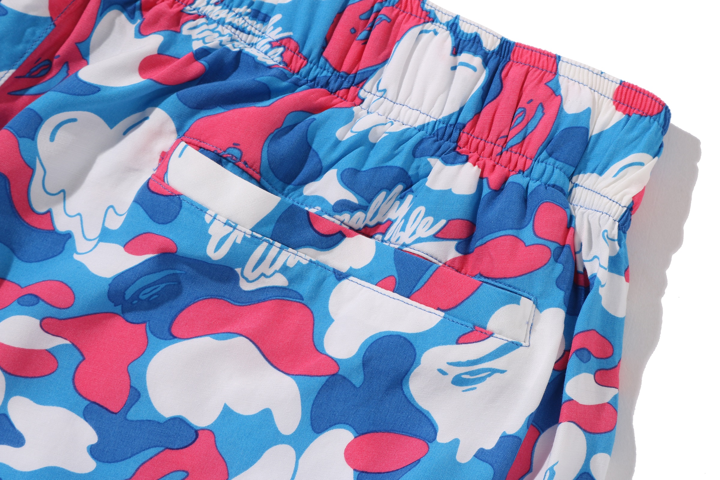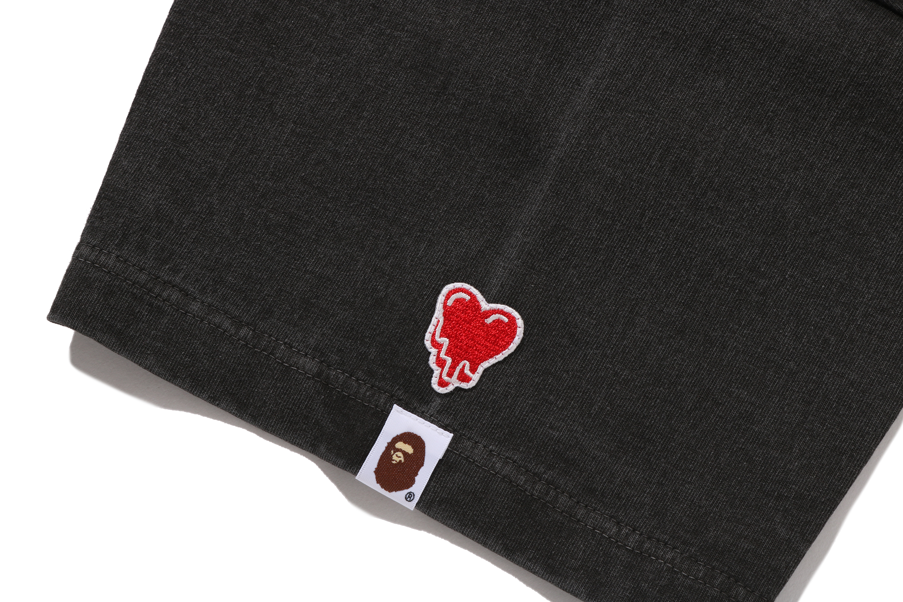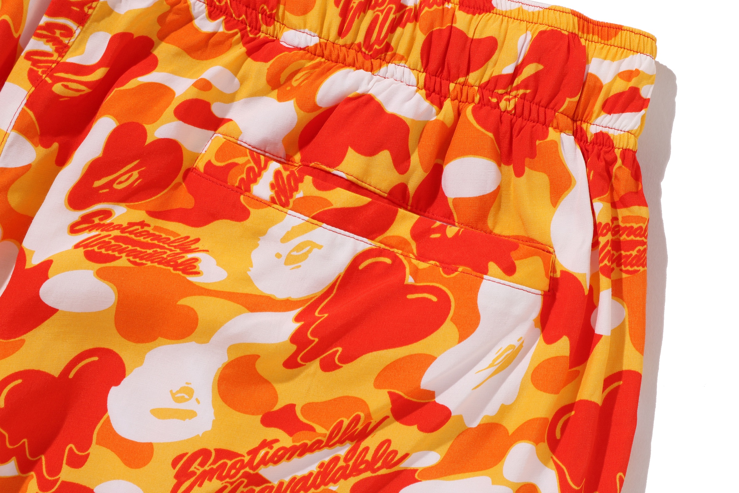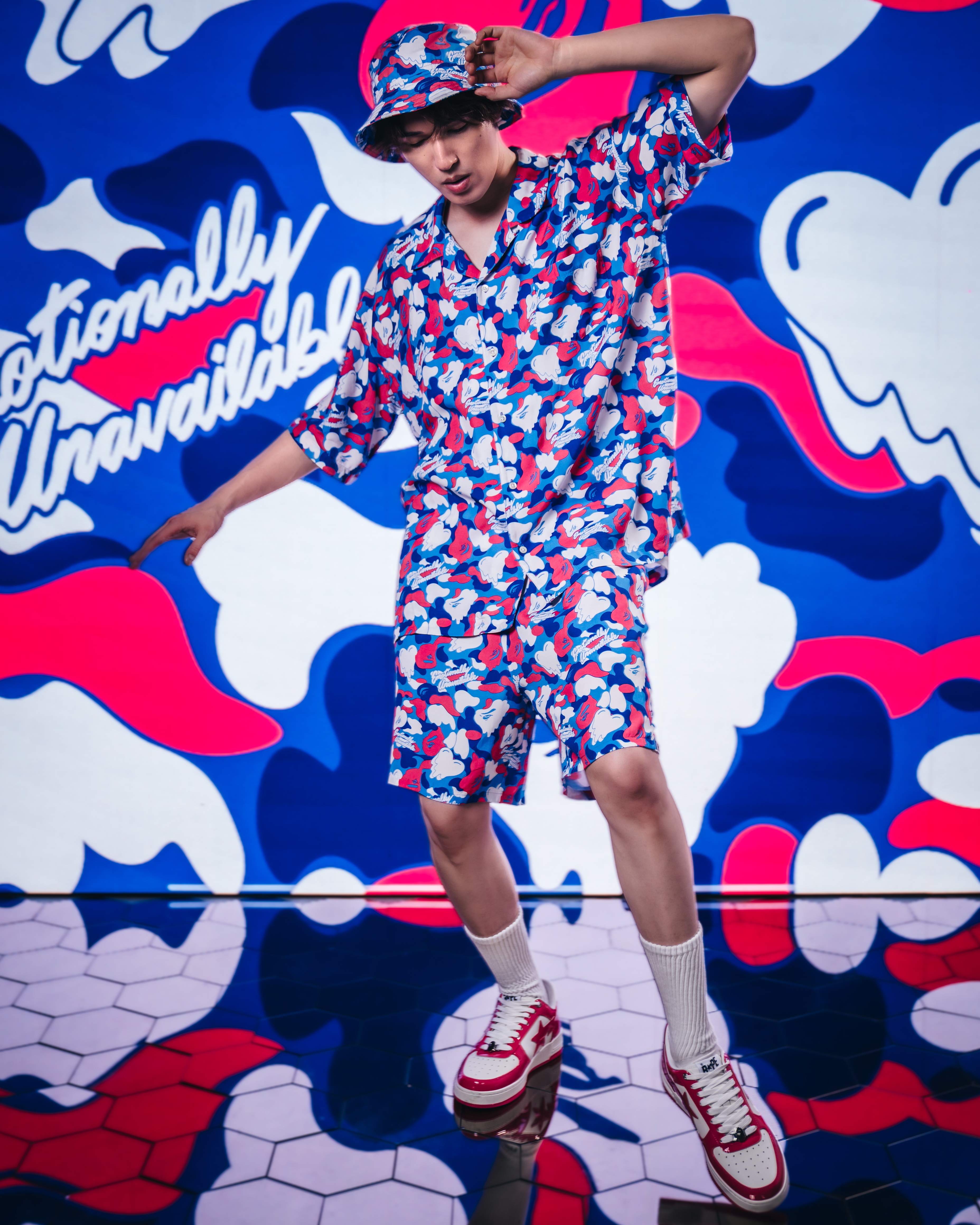 BAPE®︎のシグネチャーであるBAPE®︎ CAMOに、EMOTIONALLY UNAVAILABLEのロゴとハートモチーフを組み合わせ、滴る雫のようなグラフィックで再構築したオリジナルカモ柄が特徴。