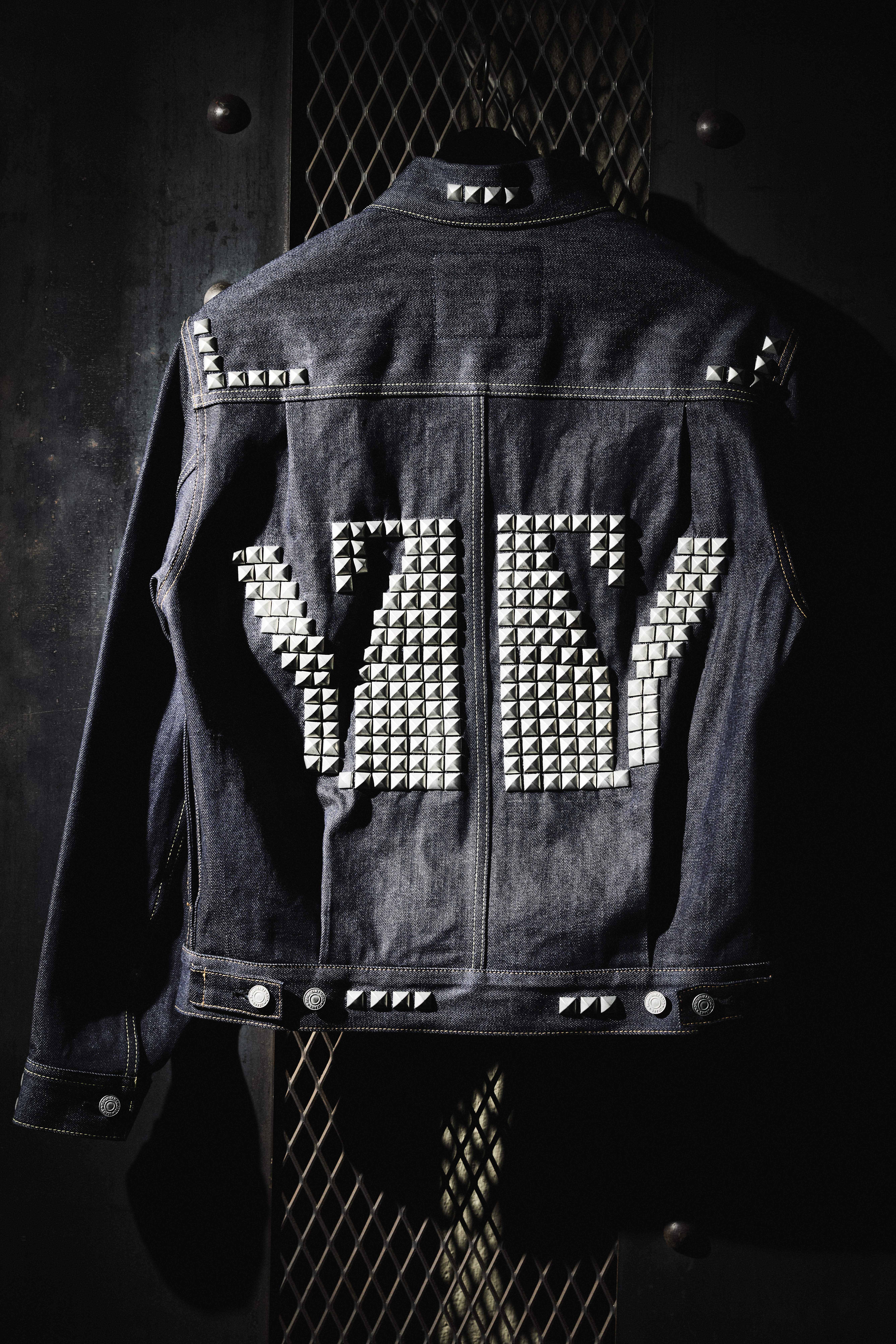 圧巻なのは、インディゴ配色のジャケット背面に施されたYYのアートワーク。ピラミッドスタッズを精緻に配し、下地との空間バランスを計算し巧みに表現されたデザインは、アートピースと称される程に高いクオリティを誇る。