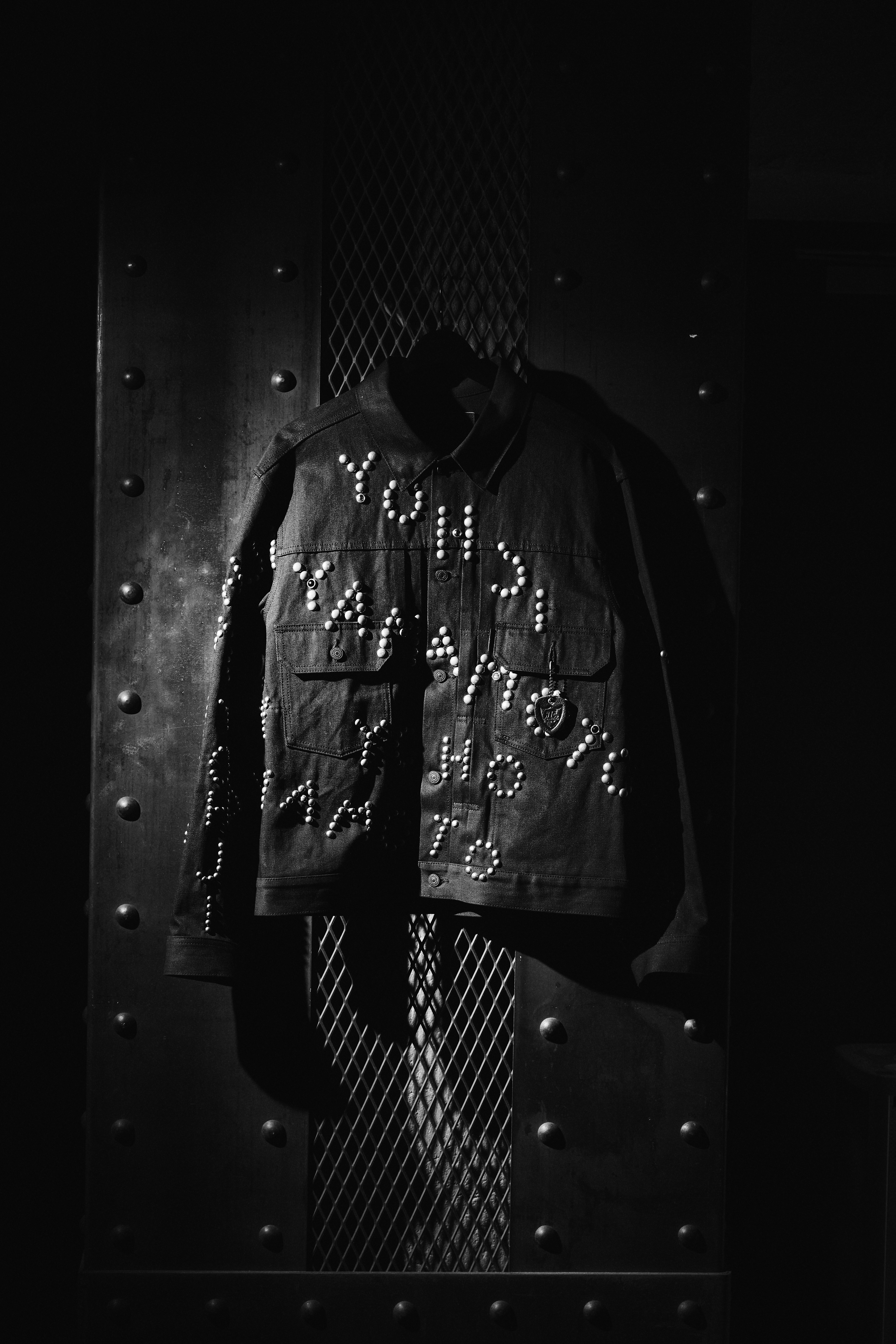 Yohji Yamamoto POUR HOMME がオリジナルで作成した国産デニム生地の2nd型デニムジャケット。本ジャケットを ベースモデルに、HTC を主宰する Zip Stevenson氏がハンドメイドのスタッズワークを施した仕様。背面に施した無数のピラミッドスタッズで表現したYYロゴのアートワークは、Tバックのディテールを巧みに活用し左右均等配置した精緻且つ印象的なデザイン。ジャケット正面には1972の文字列をスタッズで表現した圧巻の仕上がり。少量限定生産品。